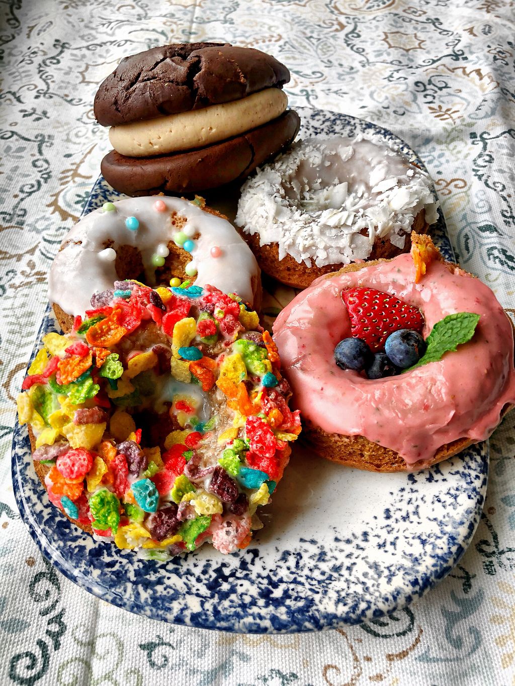 Stopped in here traveling from Rhode Island to Laconia NH. It was later in the day so the selection was dwindling, but there were still quite a few items available. Picked up coconut donut, frosted donut chocolate chip cookie sandwich, vanilla cupcake with sprinkles and vanilla frosting. All the staff were engaging and friendly, they even offered us a free fresh cookie. It was something like a butter cookie with raspberry jam and almonds. Even the other customers were friendly and we all talked and were social right off the bat. In addition to the baked goods we picked up there were other donuts, large cake slices and other cupcakes, muffins etc. they also offered jalapeño nachos with veggies cheese. Mac n cheese pizza rolls and more. The prices are very reasonable and the quality is top notch. It seems they can make things to order and even full size cakes for your special event. I wish they had some ‘pop tarts’ available when i stopped by but thats my fault for coming by too late! Highly recommend this place.