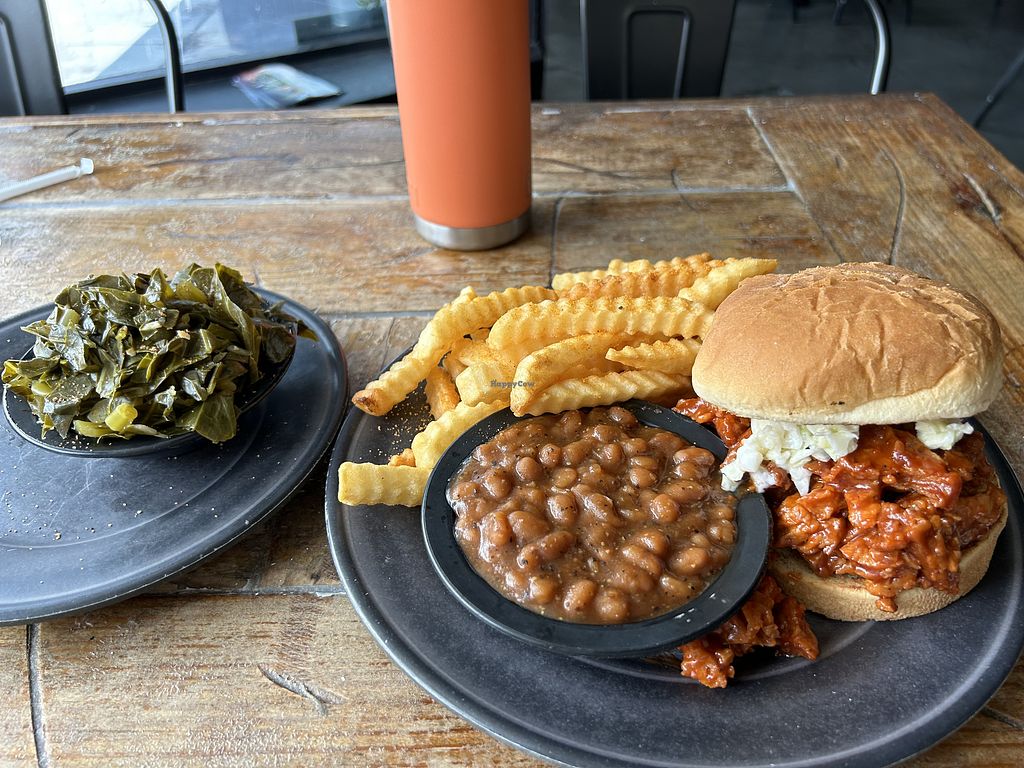 Ordered the Vegan Memphis Sandwich Platter with seasoned greens. My favorite was the BBQ beans. The greens were pretty good the sandwich itself was tasty but I couldn’t finish it and barely touched the fries, it just was a lot of heavy food. Had to take a long walk to Overton Park afterwards.