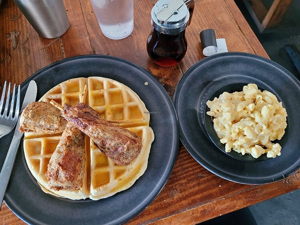 We had the Memphis BBQ sandwich and chicken and waffles. Both were good. BBQ sandwich was sweet and the BBQ beans had more pepper. Should have substituted the Mac ‘n cheese for the fries. Fries were fine but not unique. Smoothie was good too.