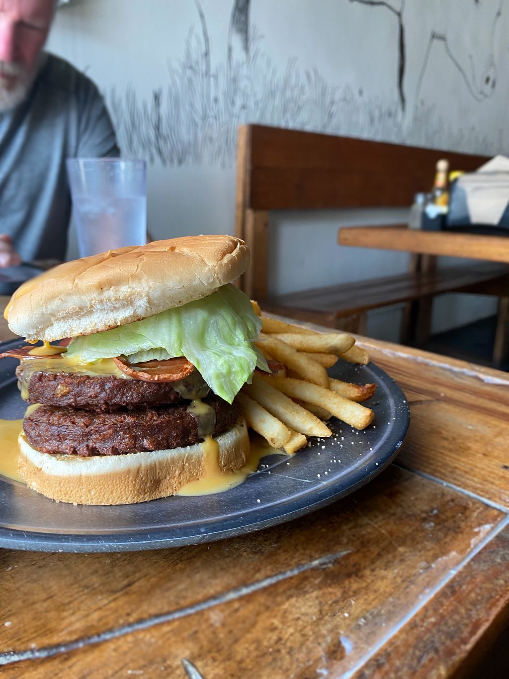 Double burger with back and nacho cheese. With fries.