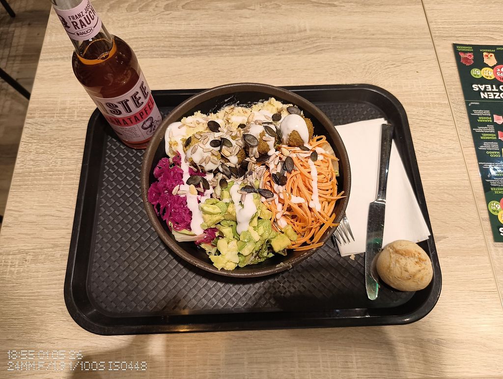 Serves meat, vegan options available. German franchise eatery offering a menu of smoothies, juices, wraps, salads, and paninis. Vegan options are marked and include salad, a couple of wraps, and a mashed potato dish. Order at the counter. Open Mon-Sat 10:00-20:00. Closed Sun.