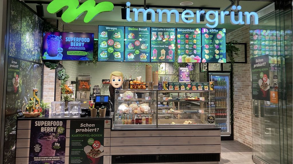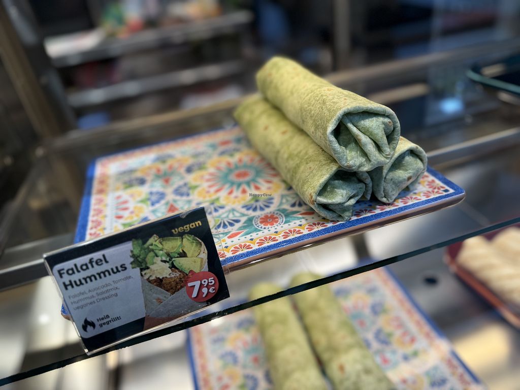 Serves meat, vegan options available. German franchise eatery offering a menu of smoothies, juices, wraps, salads, and paninis. Vegan options are marked and include salad, a couple of wraps, and a mashed potato dish. Order at the counter. Open Mon-Sat 09:30-20:30, Sun 11:00-19:00.