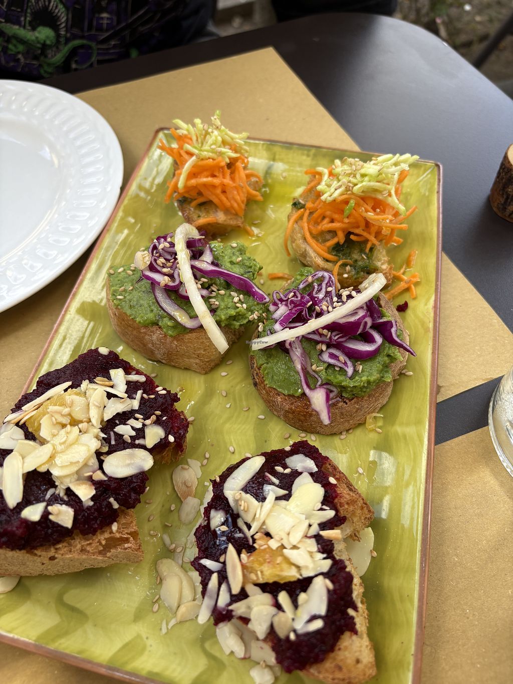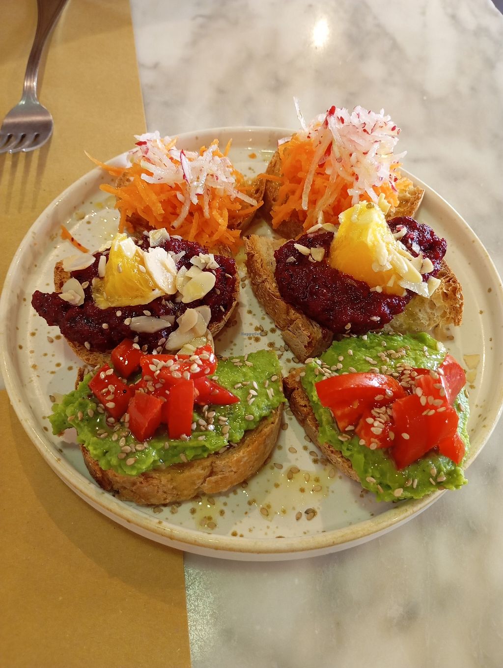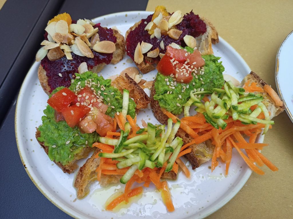 Read moreThe bruschette looked great but the taste was nothing special. One was just cut up raw carrot and courgette on oil, the second tasted like purreed beetroot out of a glass. The third one had mashed peas on it and was okay.