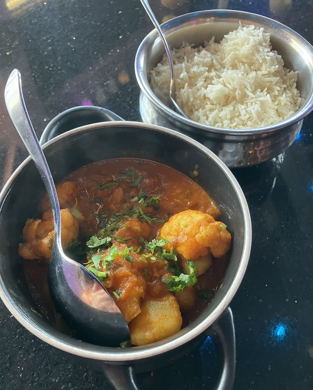 Serves meat, vegan options available. Indian restaurant with labeled vegan options including aloo gobi, bhindi masala, hara masala, and more. Open Mon-Sun 11:00am-9:30pm.