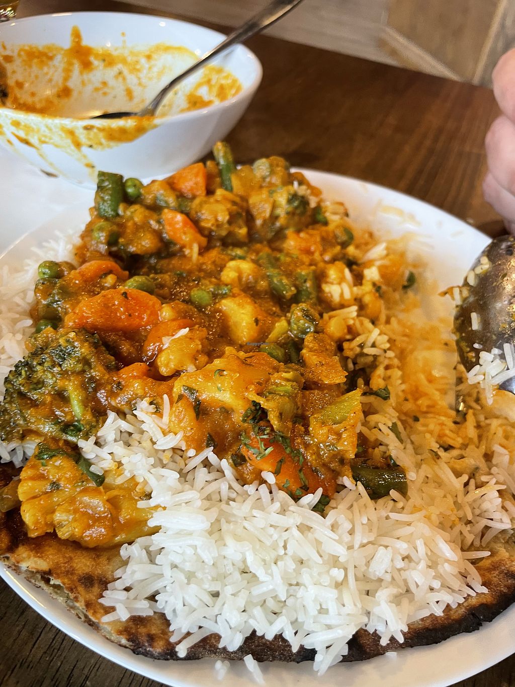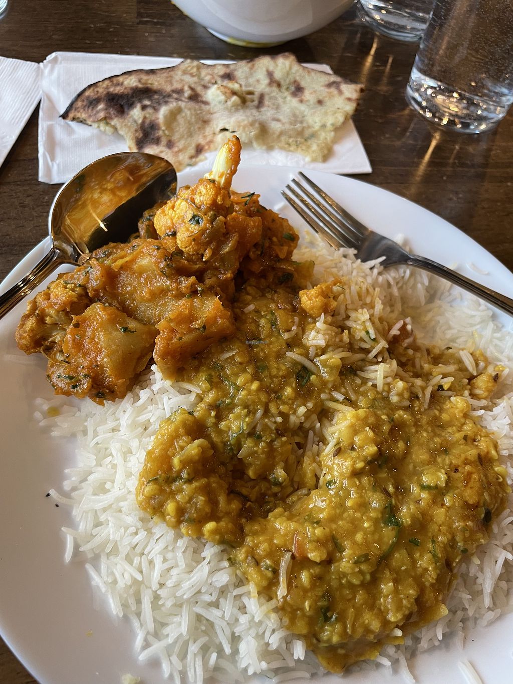 Large salads incl a chickpea one, which was great for protein. In terms of vegan mains, only vegetable jalfrezi stood out. Roti was marked as vegan friendly, but looked like served with butter. (But probably I should have asked for it to be served without butter).