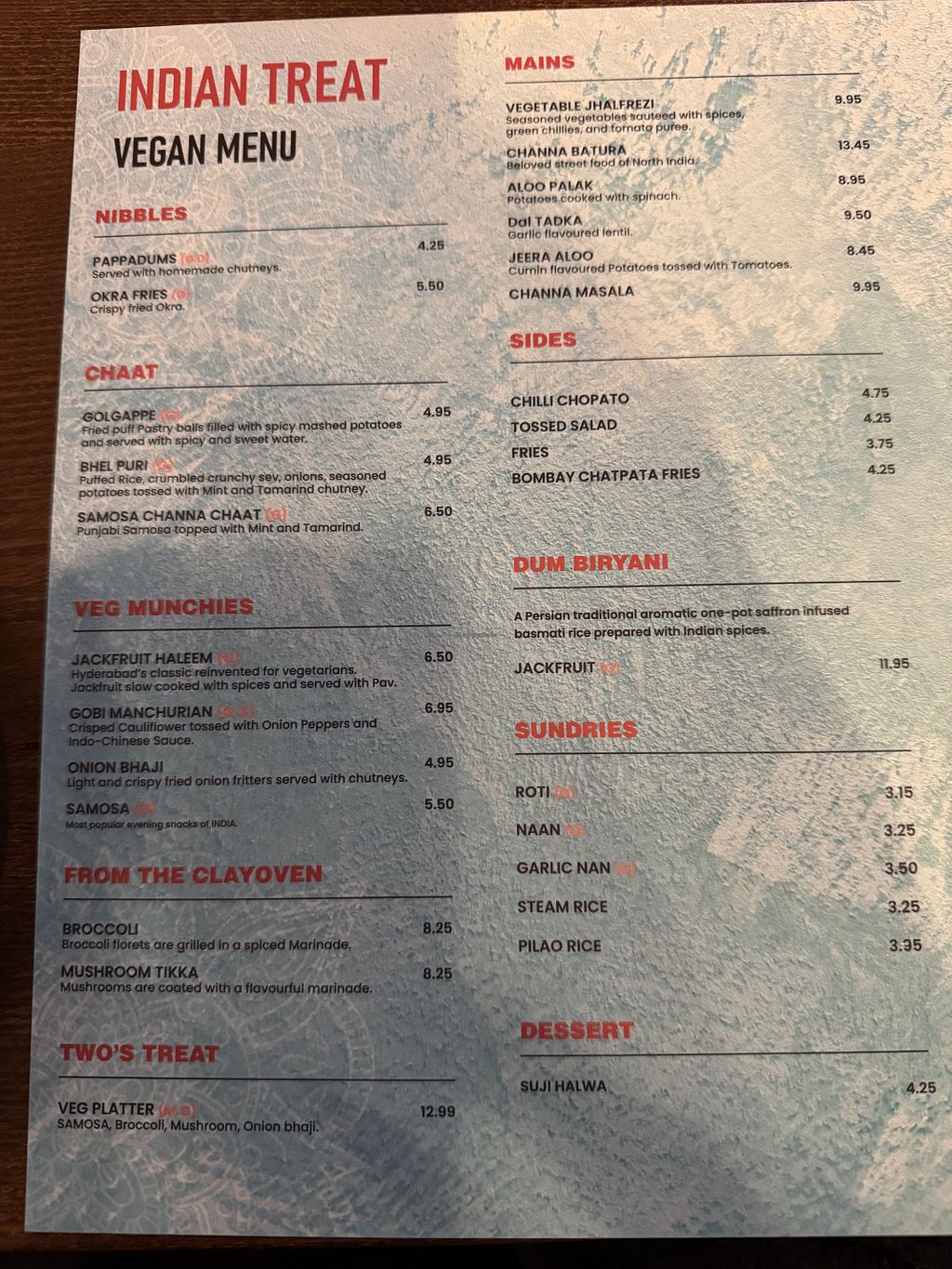 Serves meat, vegan options available. Indian restaurant offering a separate vegan menu with items like okra fries, golgappe, bhel puri, and samosa channa chaat. Mains are vegetable jalfrezi, aloo palak, dal tadka, jeera aloo, channa masala, channa batura, and dum biryani. Open Mon 12:00-22:00, Wed-Thu 12:00-22:00, Fri 12:00-23:00, Sat 13:00-23:00, Sun 13:00-21:00.