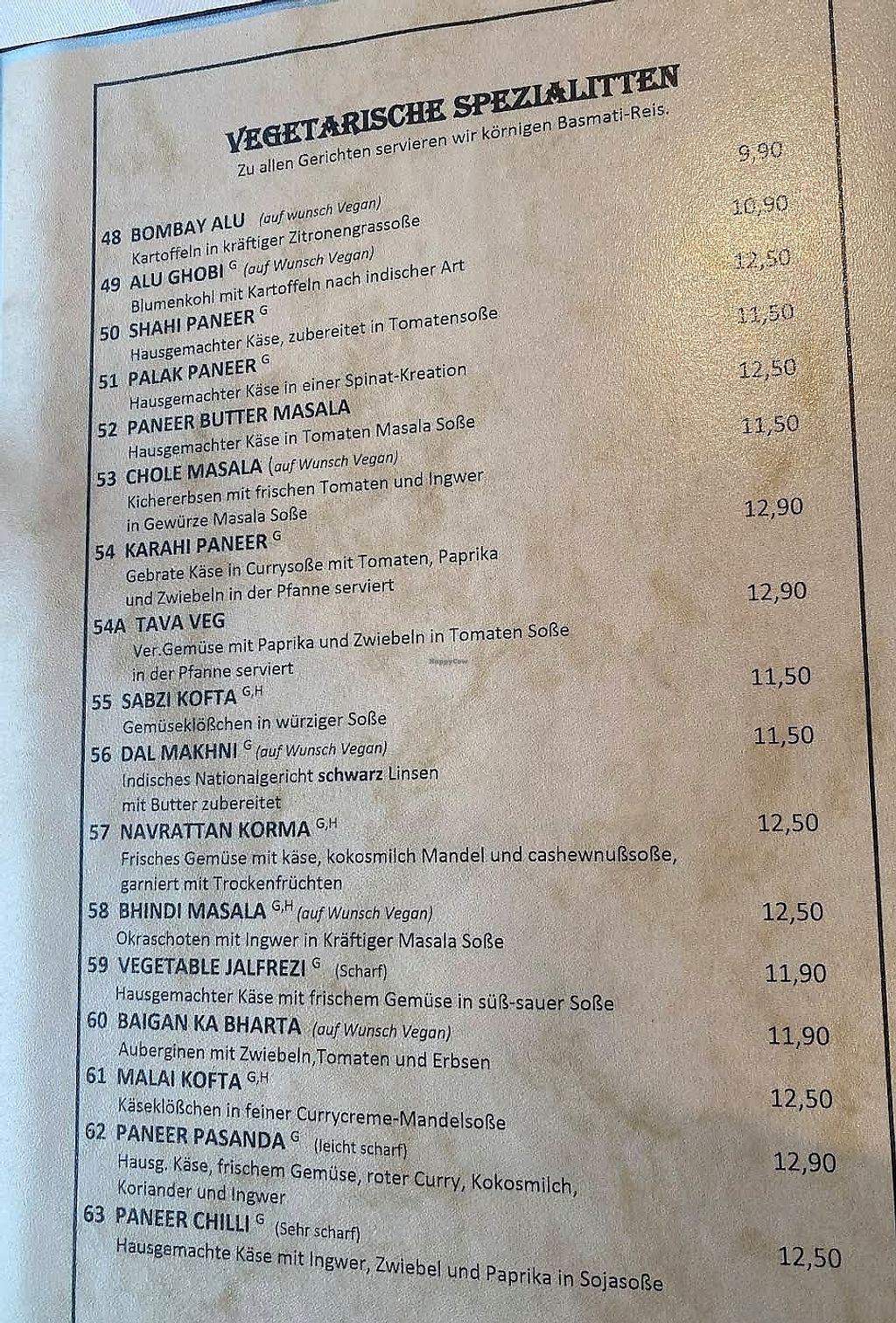 Serves meat, vegan options available. Indian restaurant with clearly labeled menu. Example vegan offerings include vegetable pakora, onion bhaji, vegetable manchurian and poppadom. Open Mon-Fri 11:30-14:30, 17:30-23:00, Sat 17:00-23:00, Sun 12:00-22:00.