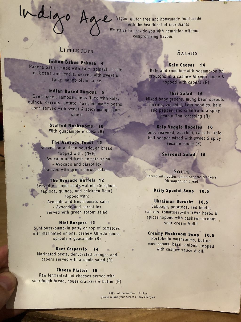 I have been able to go to Indigo Age twice so far. The first time, I loved the decor- it's decorated like an idealized, woodland pixie's treehouse- and I also loved the cheese plate and golden mylk I ordered. The cheeses are delicious and beautifully presented, and the sourdough bread that comes with it is really good.