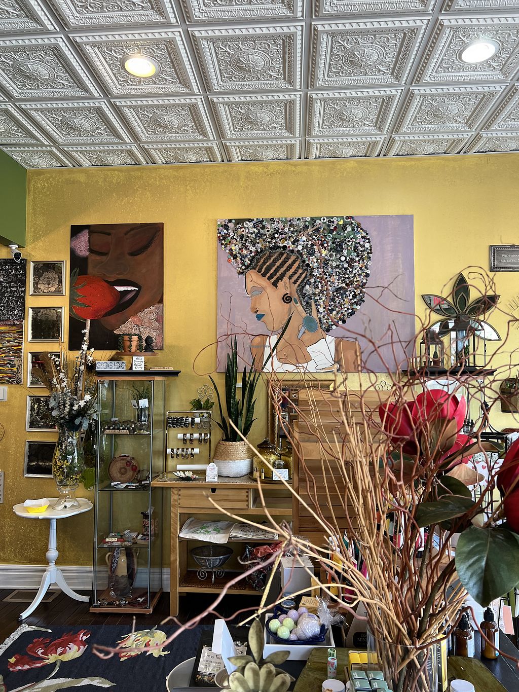 Cozy, light, plant, and art filled room with a few tables for eating-in. I love the food and the decor! Lots of great art, jewelry, bath/body products available, too. We loved everything we ordered.