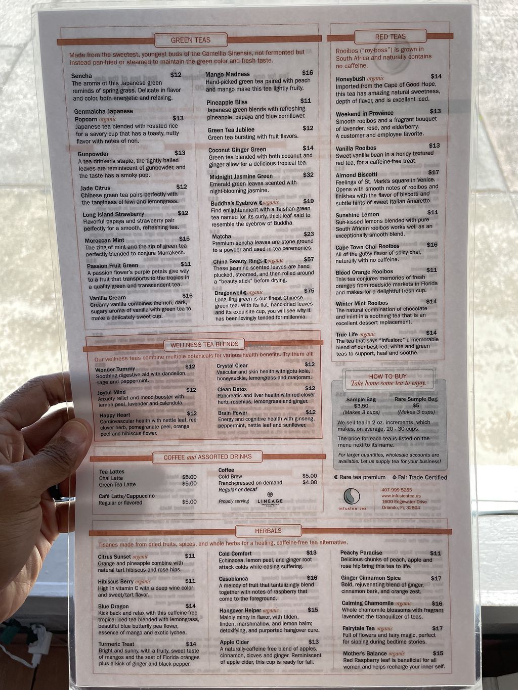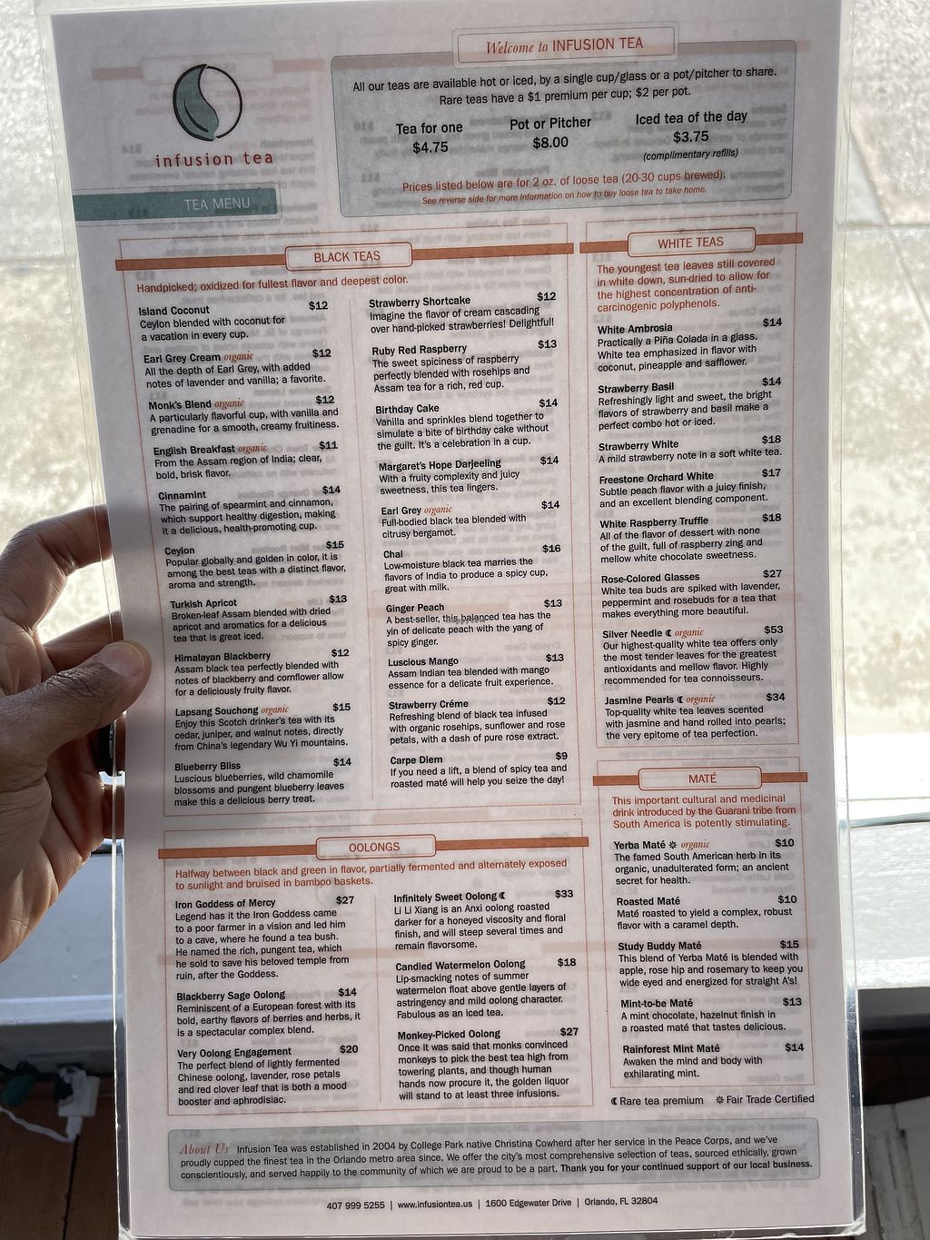 The freshly brewed tea is top notch and the baristas are so knowledgeable! My favorite currently is an iced “Earl Grey Cream.” Lots of vegan treats and lunch options. Also sells small gifts and products from local artists! An Orlando favorite!