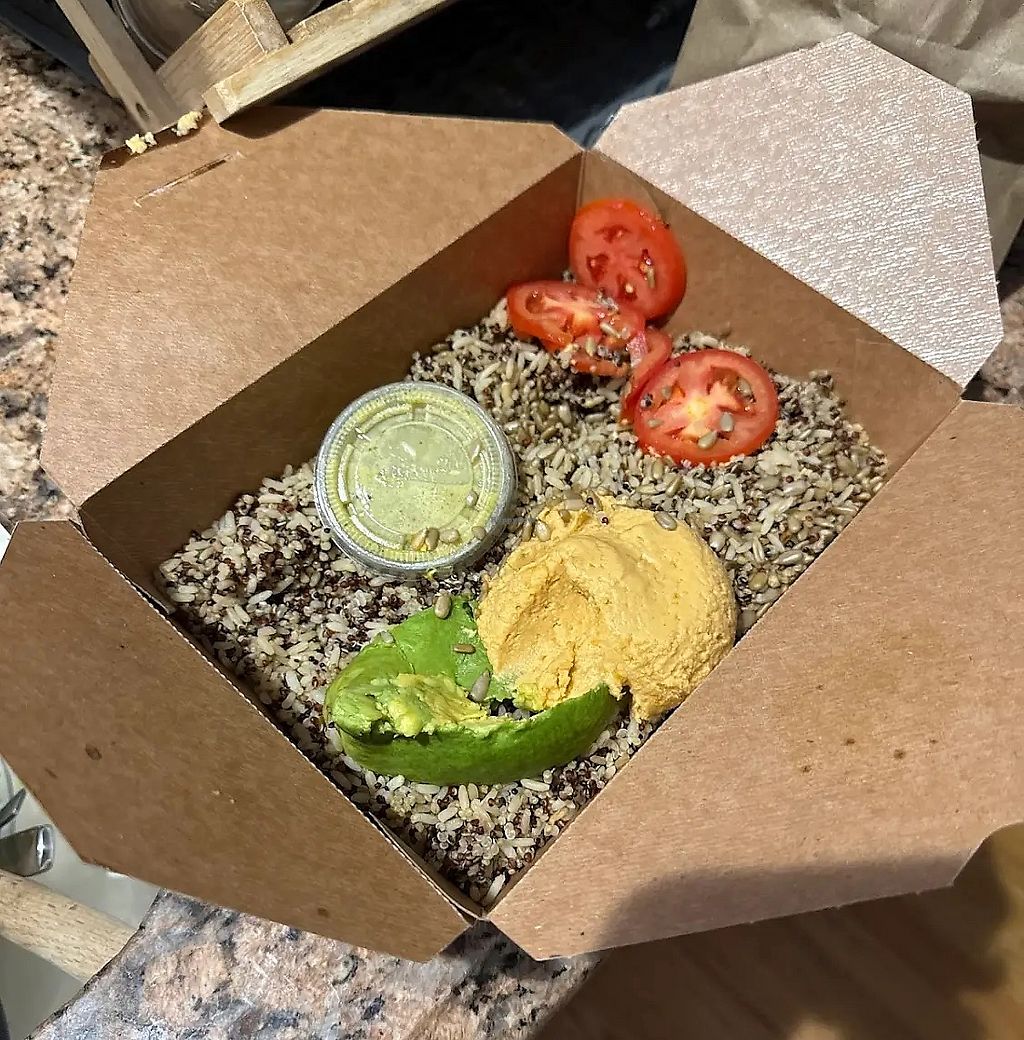 Ordered the avocado delight over quinoa/rice. See the images for what I got… Looks like bird food. $14 for what? half an avocado and some dressing?