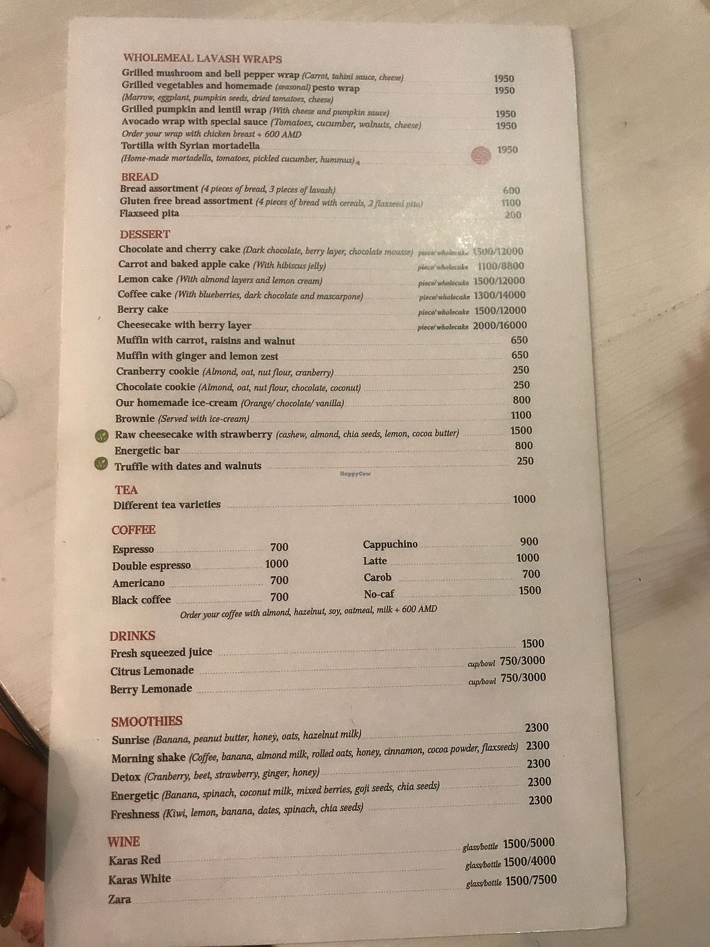 I was a little bit disappointed by Ingredient. While I was glad to find a vegetarian-friendly restaurant in Yerevan, I found the food to be a little bit dry and lacking in flavour. They didn’t seem to be clear on which things were vegan and the prices didn’t match on the English and Russian menus. That said: the cakes were tasty, the stuff was friendly, and the atmosphere pleasant. All in all, not too bad