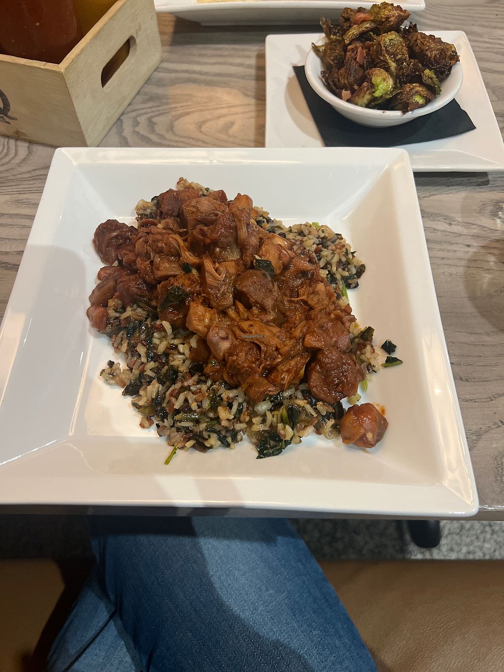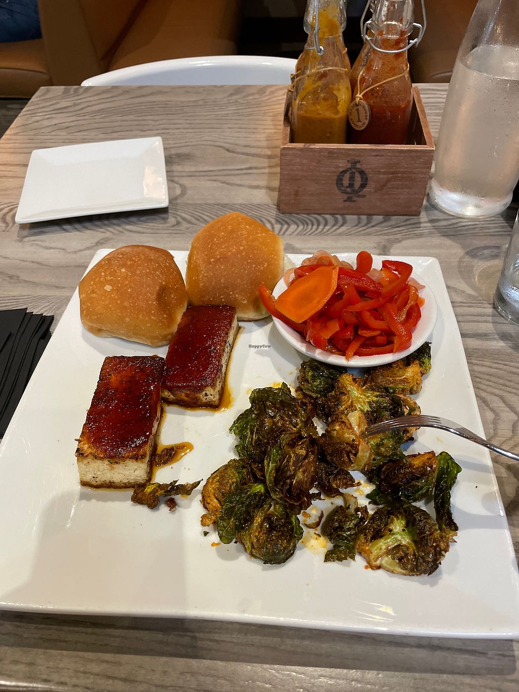 BBQ Jackfruit, Brussels sprouts, sweet potato fries