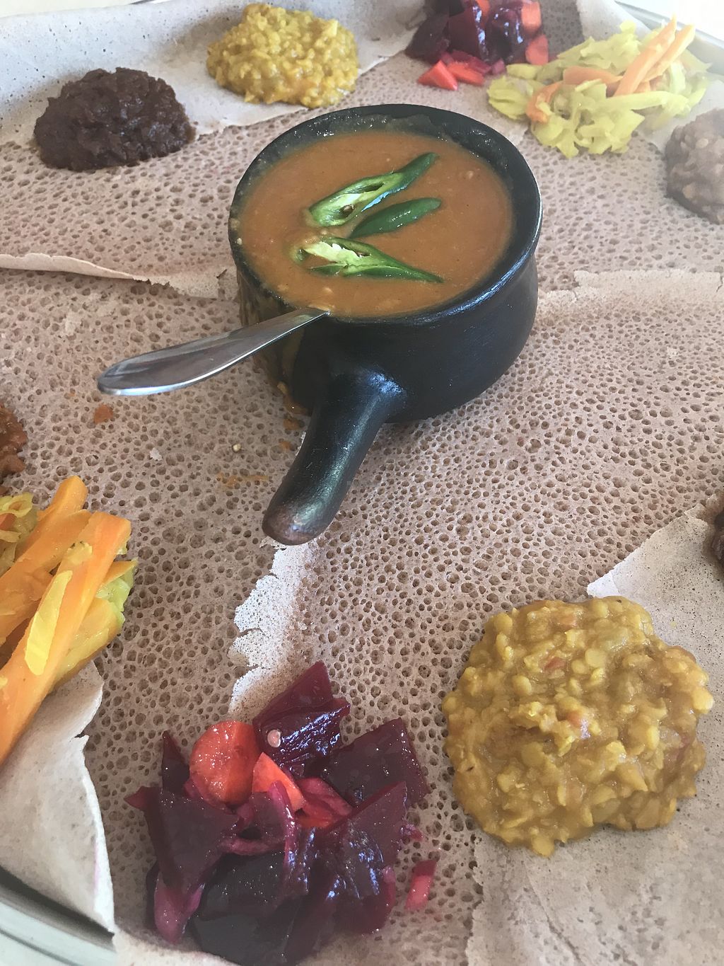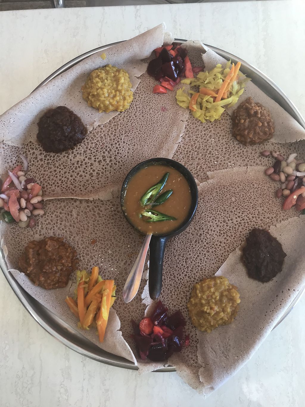 First time we had Ethiopian food was in Brussels. Hubby and I are both vegans & when we found out that the restaurant was a vegan restaurant (Toukoul) we had to give it a go. The food was beyond delicious! We coupdnt believe it! Fast forward a few years and we found injera house. Weve been meaning to visit for a while and then 2020 happened! One casual Saturday afternoon, we thought, should we? Or shall we keep the amazing memories in Belgium and not risk a bad experience! We thought, hey, why not! Let's go. We walked in, the smile of the gentleman (i think he could have been the owner) at the counter was so warm and inviting that we were already happy to have walked in. I told him about how great our exprience was in Europe and how delicious is the ethiopean food. Asked him about what he recommends (vegan) cause let's face it we had no clue! He said he will make us a platter with a few dishes. Omg! May I just say! BETTER THAN BRUSSELS! the food was so delicious! Such generous serving! The service! The cleanliness! The price! This place, honestly, this place is a hidden gem! That was 3 Saturdays ago. Before I finished work today, I called the hubby! "Hey! You wanna go to injera for dinner straight after work?", he replied "heck ya"! ... pulled out of car park, he goes "you wanna check if they are open?", me: " off course they are open! Hello?!"- him: "just check!"- and reluctantly I did! And bam! Disappointment set in! They close at 5 on Tuesdays! .... & so we drove back home! Check opening hours before you head there. This place is going to be our new regular spots! You must visit specially if your vegan! Finger licking good! + super warm and friendly service. Thank you injera house! We will be back!😄