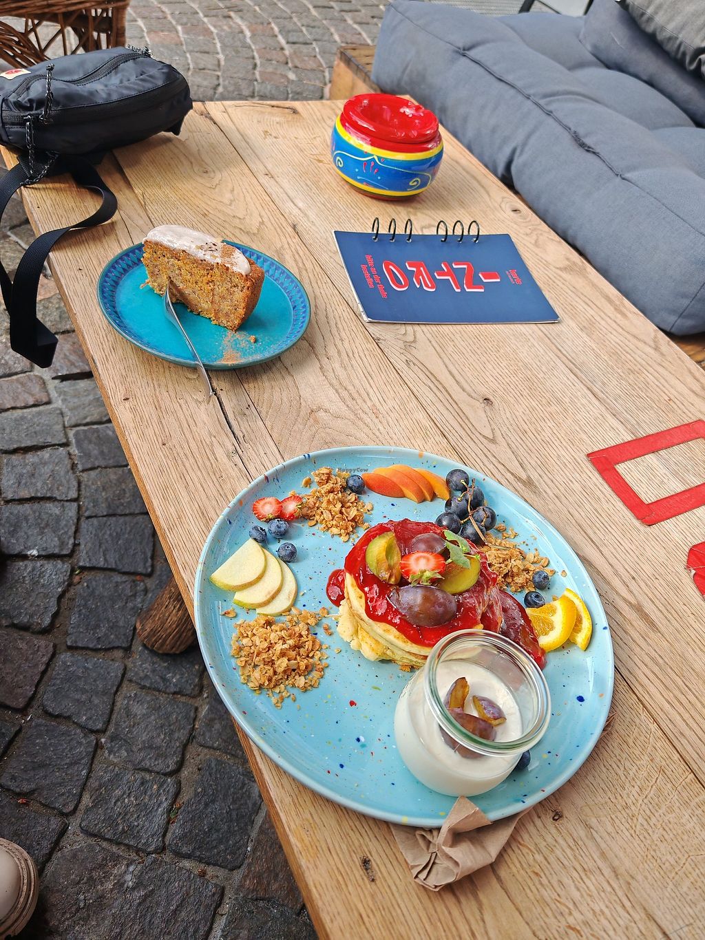 All of the dishes offered there are vegan. There is oat milk and pea protein milk. They have a consistent breakfast menu with vegan tofu scrambles, croissants, pancakes and sandwiches. There are also different cakes every day and sometimes a daily salad or something similar. The cafe there is very good, the pasta salad was very oily but still tasty. You can stay there as long as you want e.g to learn.