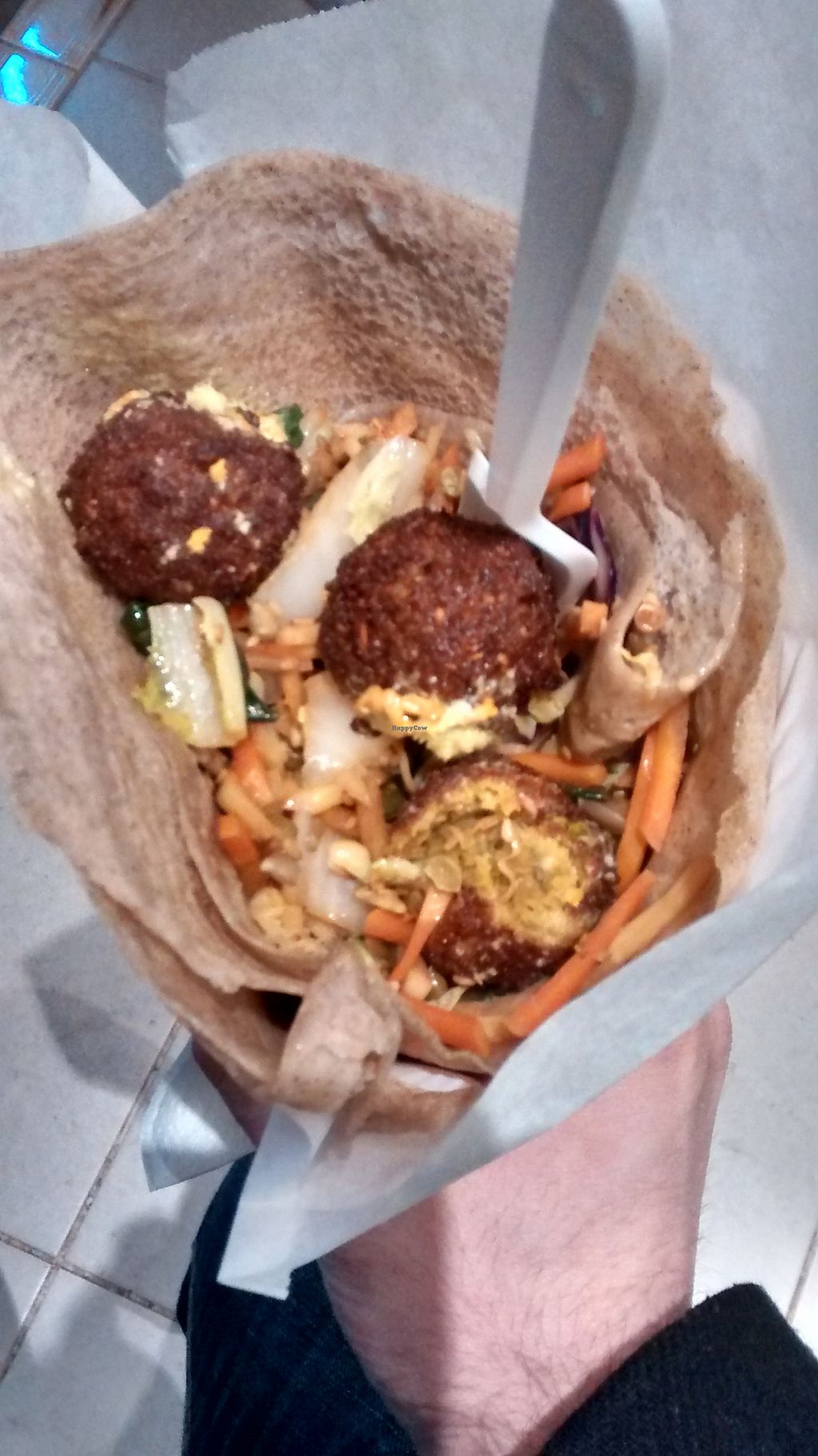 Read moreWe both had the croque-chaud, an alternative version of the falafel sandwich you can get at the Indian/Lebanese joint. The wrapping is homemade and glutenfree (rice and buckwheat flour), you may choose your assortment of veggies and to put falafel or/and kefta on top. Great tahini sauce!