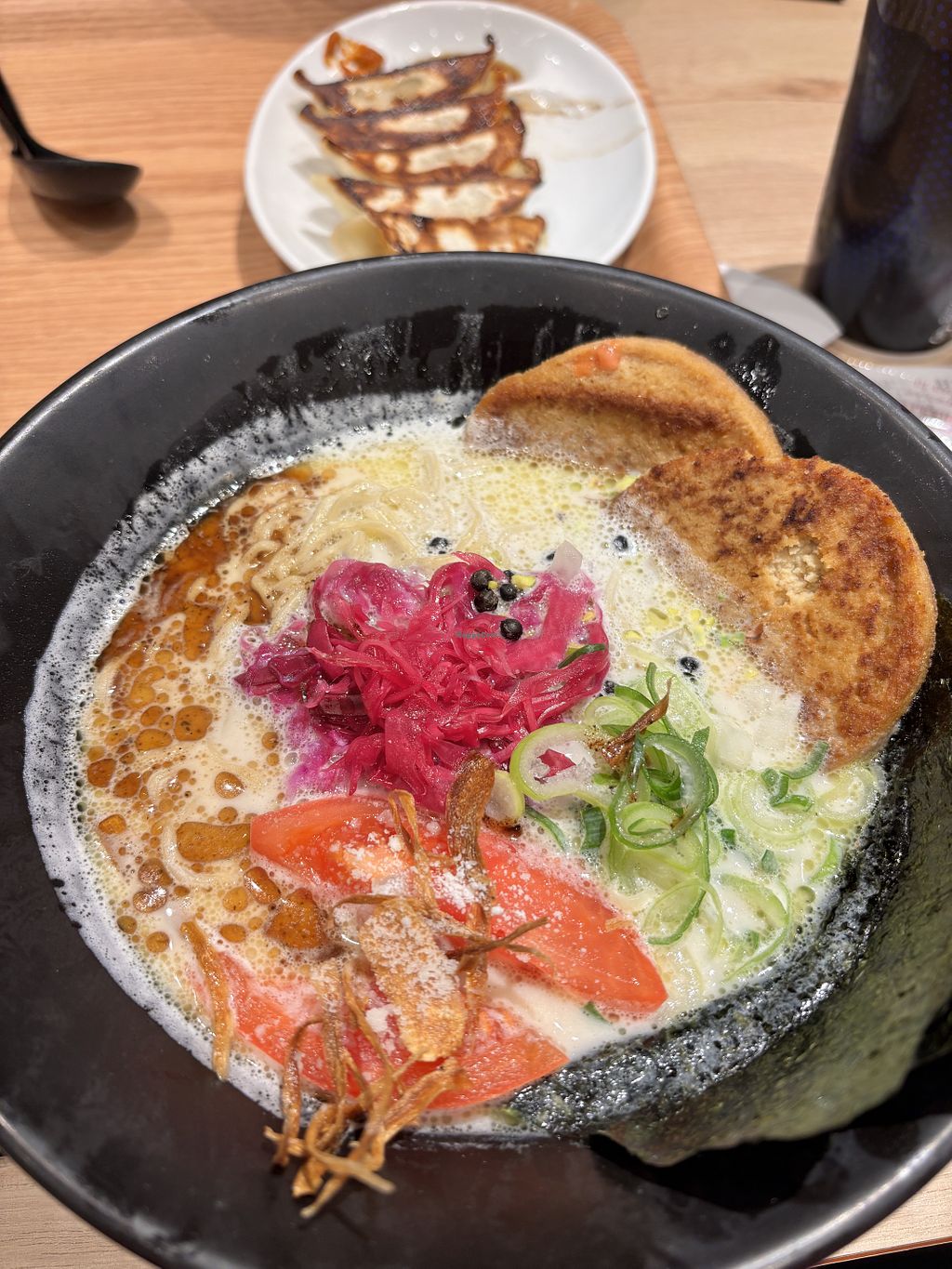 We recommend getting the big bowl. The fake meat was wonderful and the broth was incredibly creamy! The gyoza were also good!!