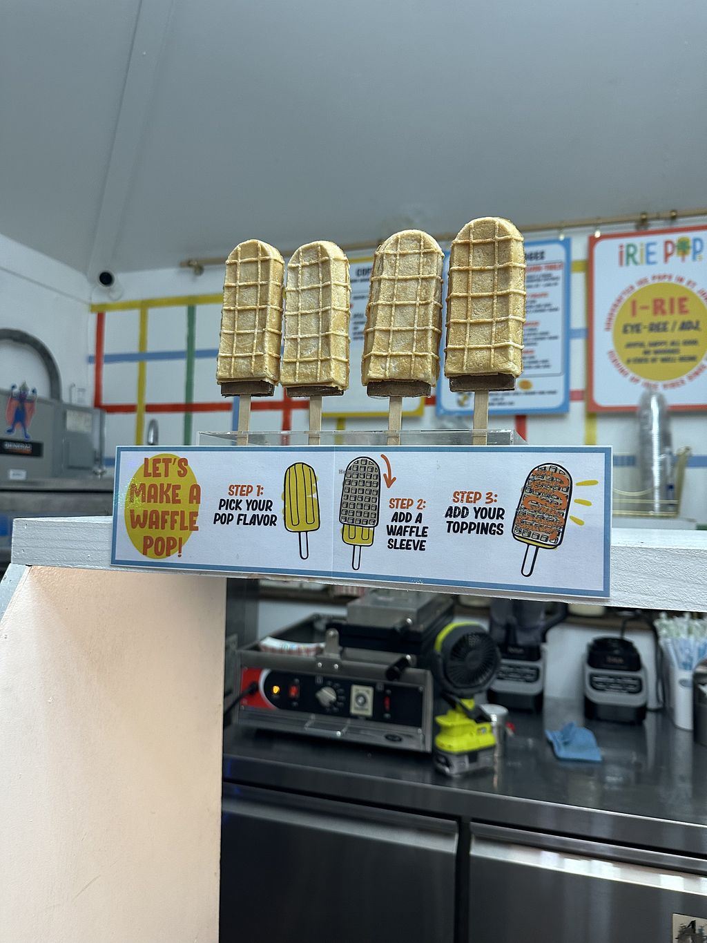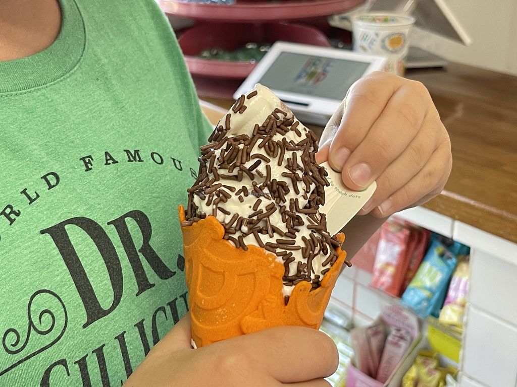 Soft serve swirl in birthday cake waffle cone and rainbow sprinkles