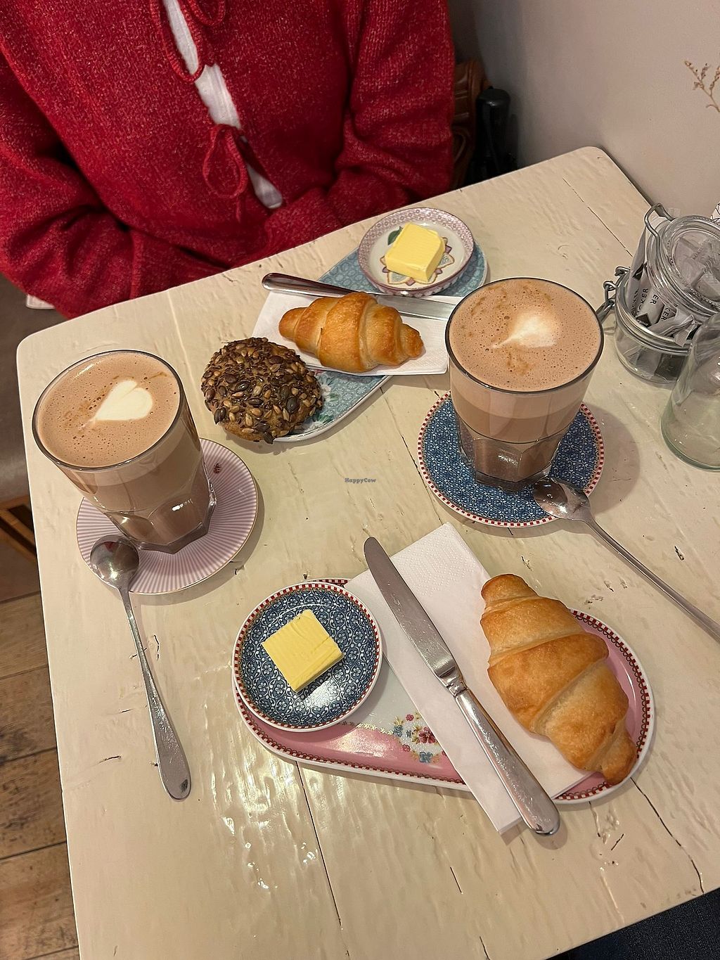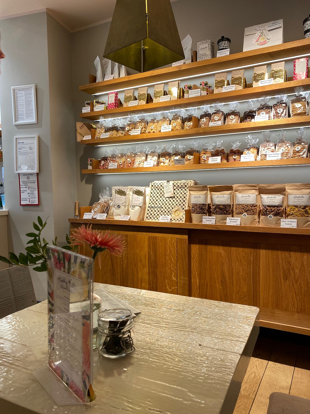 Gluten free bakery with several vegan options, including tart, biscuit and bread. Soy milk, almond milk and oat milk are available as well. Soy milk without additional charge, while the other alternatives cost 0.60€. I've been there a couple of times and was always happy with the products and their service.