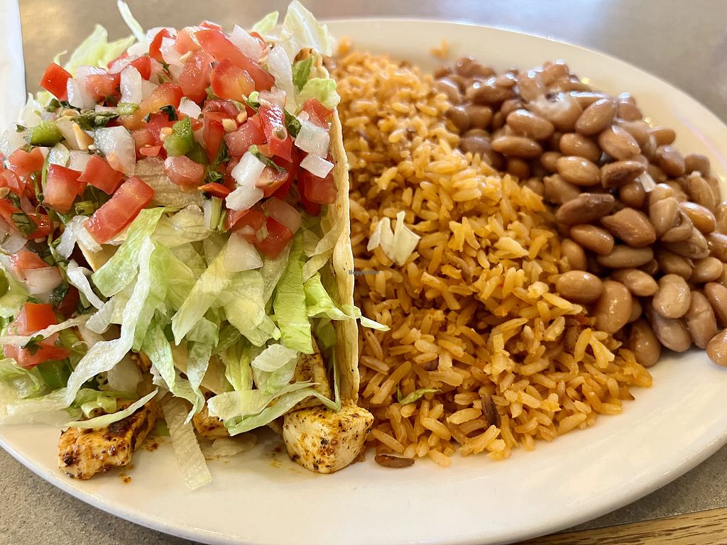 Tofu tacos, vegetarian rice and beans. Can sit outside or inside.