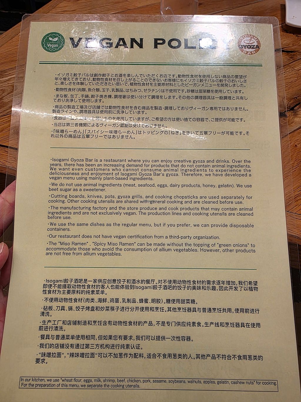 The food was fast and delicious, and and the price was reasonable, too. I ordered the spicy ramen and bean sprout gyoza (5 pieces). I’ll probably go back tomorrow to try something different. They have an entire vegan menu that is prepared separately from the non vegan food. I love places like this where you can go with non vegan friends and family and have something for everyone. There is a vegan wine menu as well.