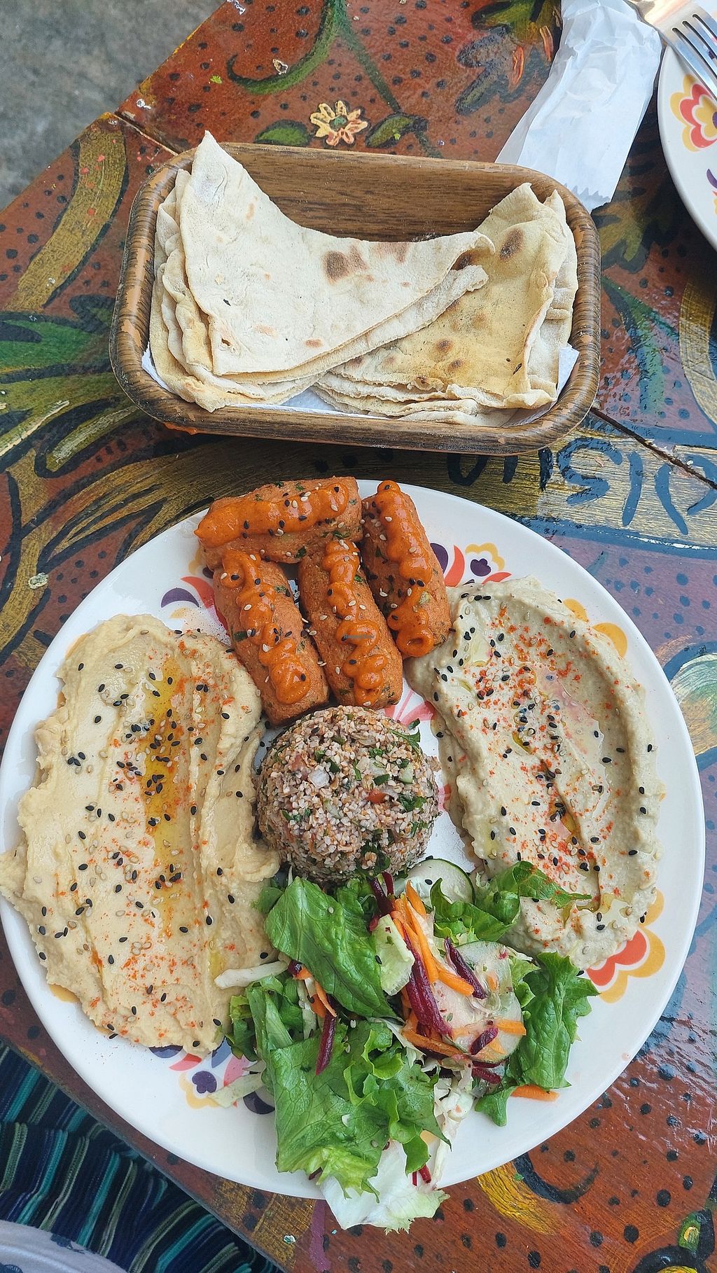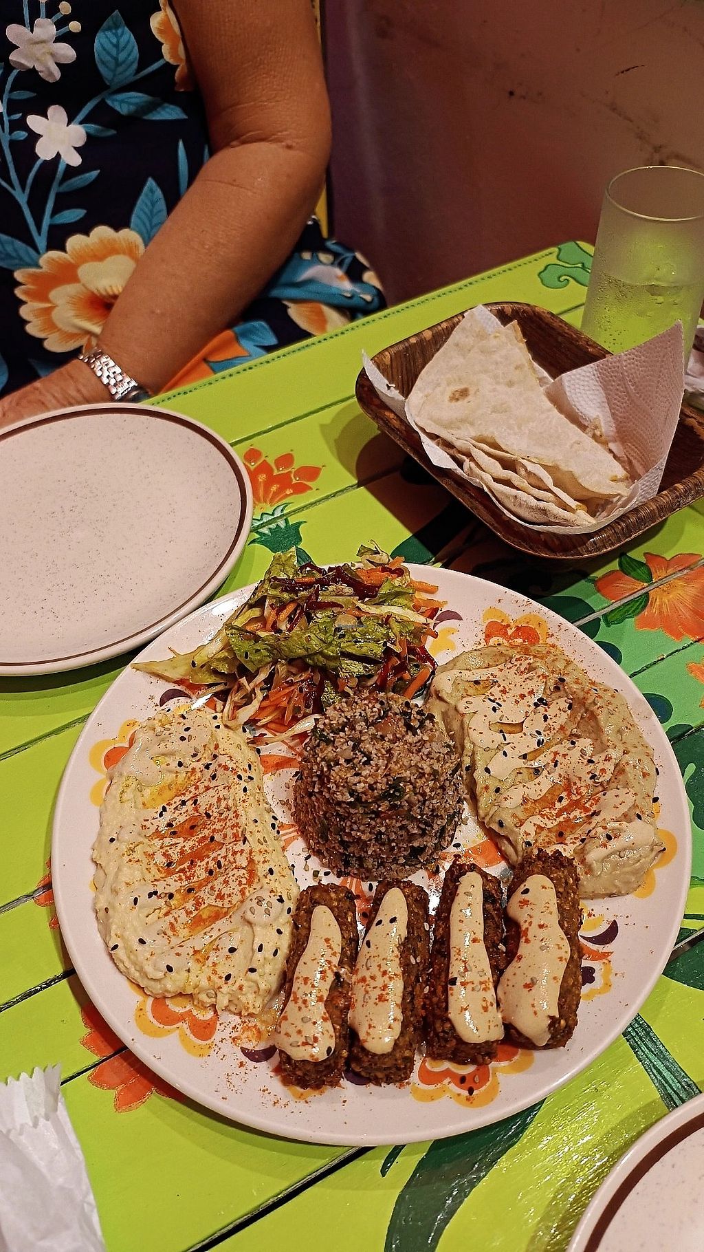Comida gostosa! Pedi o Tapete Voador, que tem hommus, babaganoush, tabule, salada e falafel, estava uma delícia é muito bem servido. Acompanha pão. O espaço é pequeno e o atendimento é ótimo!