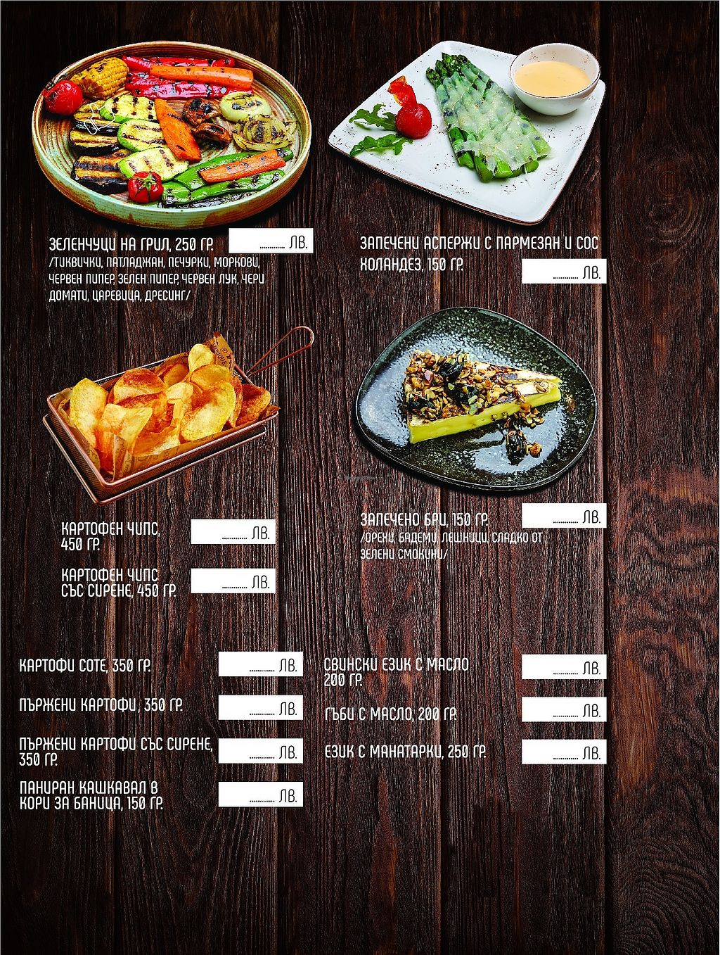 Grilled vegetables (top left), fresh chips (centre left) and fried pot…