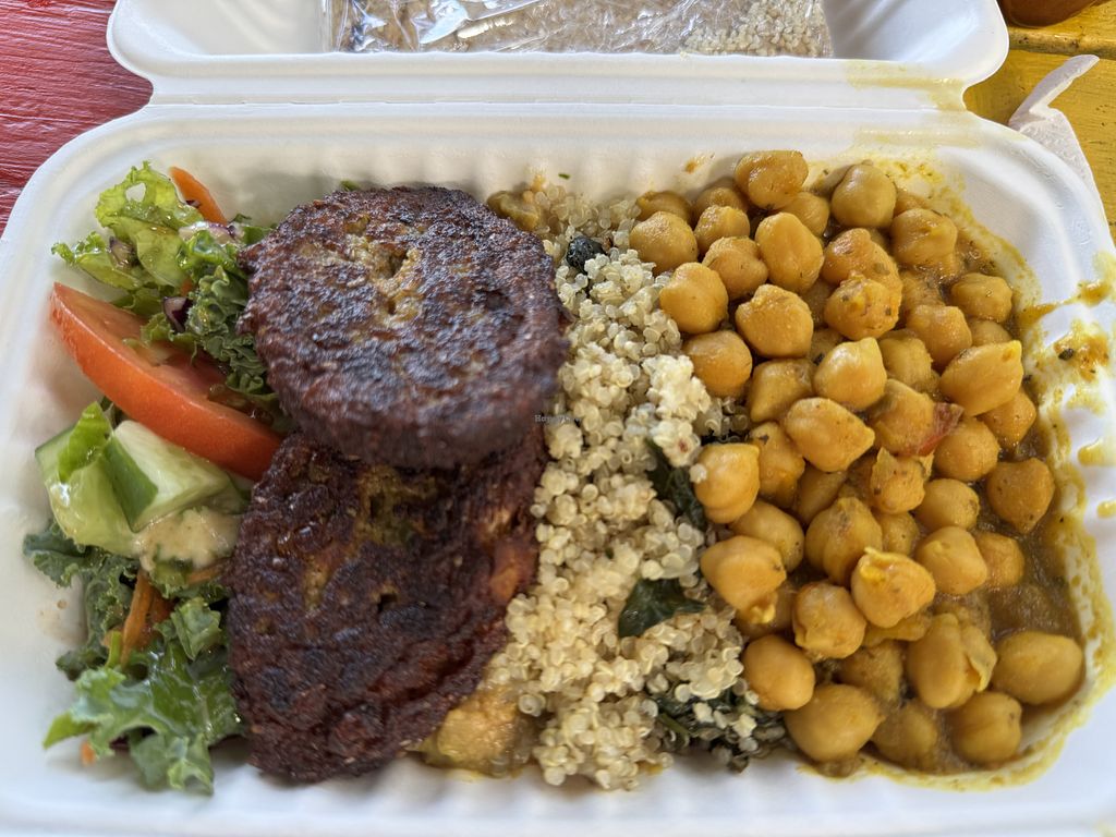 One of the daily specials. Salad, stew, quinoa, veggie nugget.