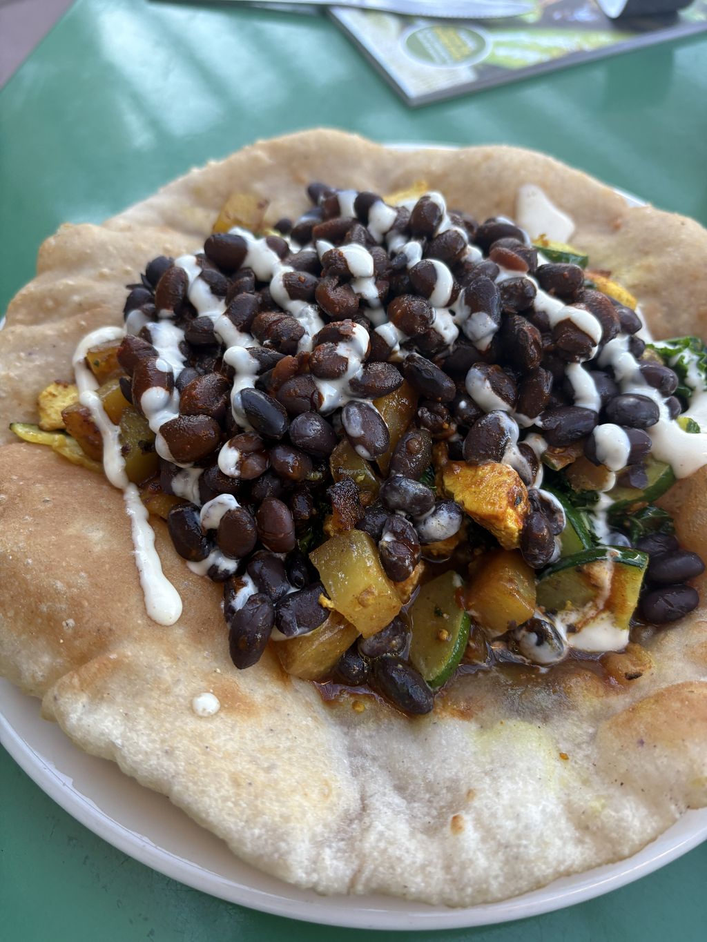 This place is vegan. I think you can ask for honey or bee pollen, but everything on the menu is vegan. They have breakfast and lunch. Everything was great and I’ve never seen vegan fry bread before.