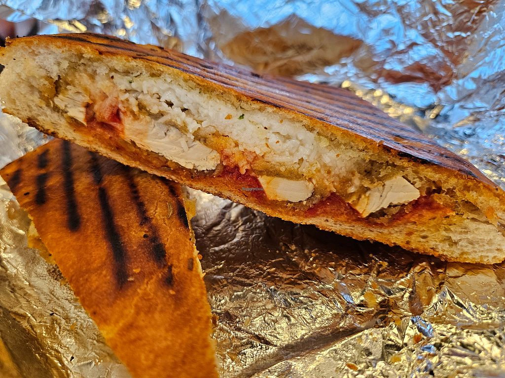 For paninis -"Plant based parm" panini with vegan chickn on focaccia bread with basil oil and vegan cheese.