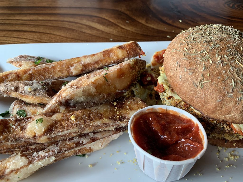 Chickpea Parmesan with a side of Sweet Potato Fries
