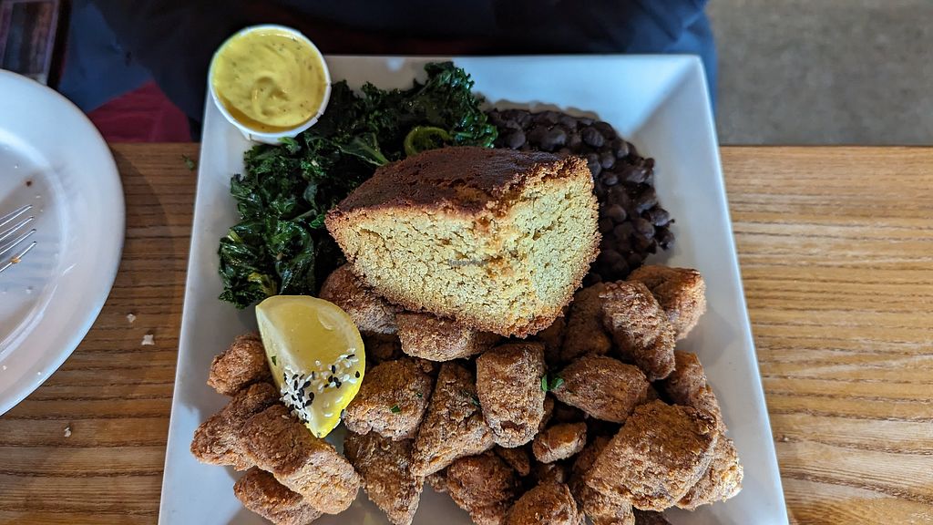 Southern platter with tofu nuggets, cornbread, greens, and beans. All …