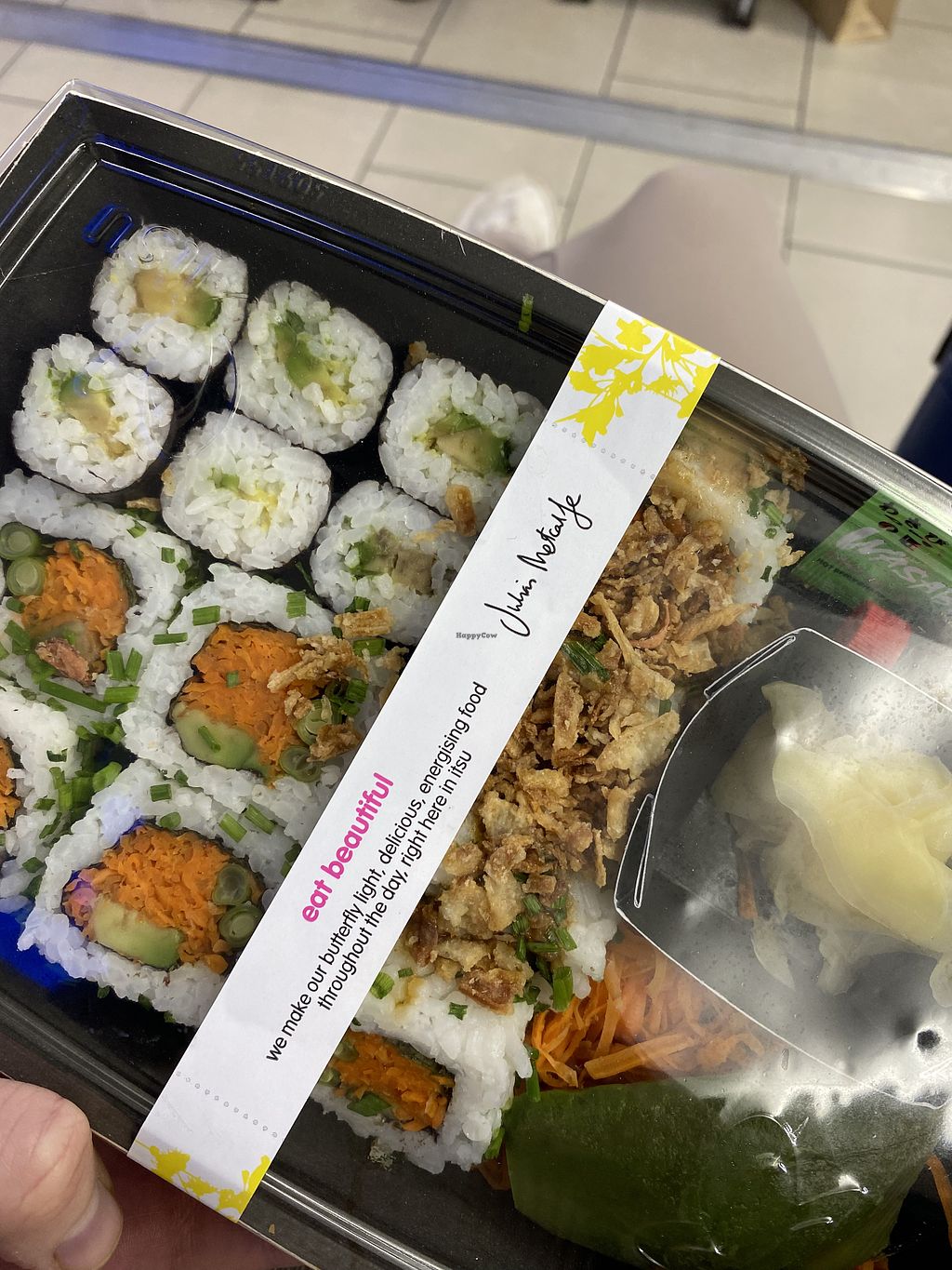 Limited menu but a fee vegan options. When I was here there was avocado maki, veggie sushi set, thai udon noodle bowl (soup) and veggie gyoza.