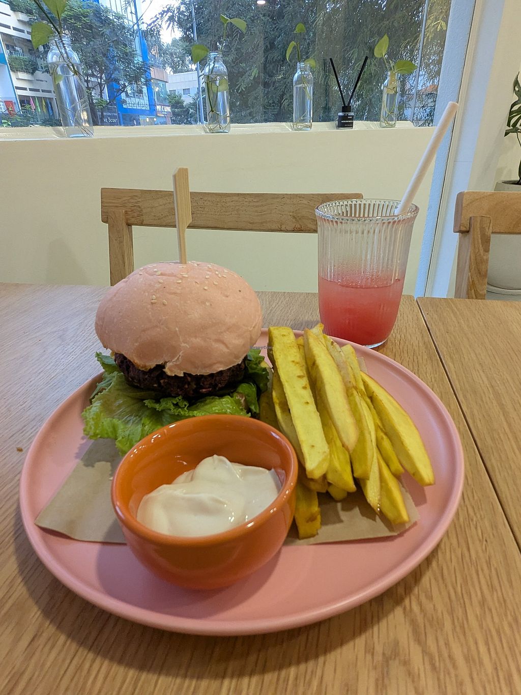 The vegan burger was really tasty and the sauce for the sweet potato fries was delicious! I had a watermelon juice on the side too which was very refreshing.