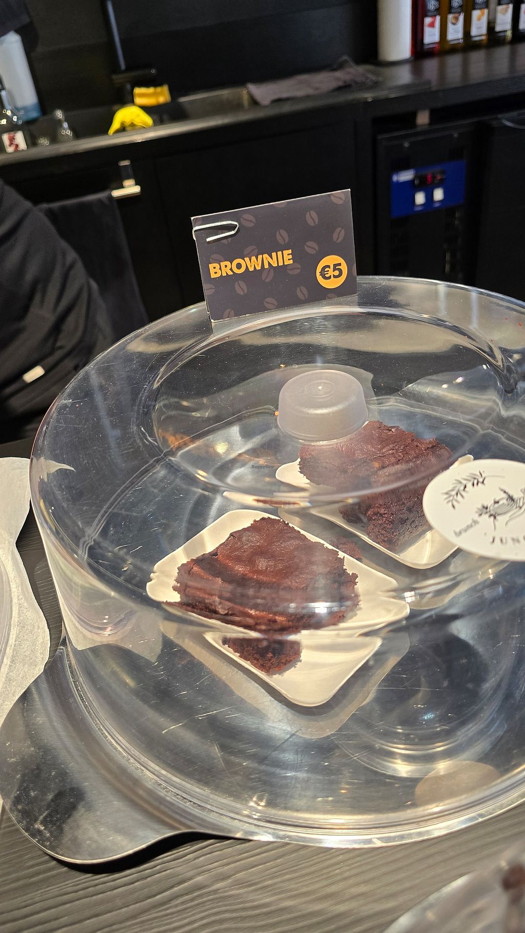 Very delicious cappuccino with barista soy milk and good chocolate brownie.