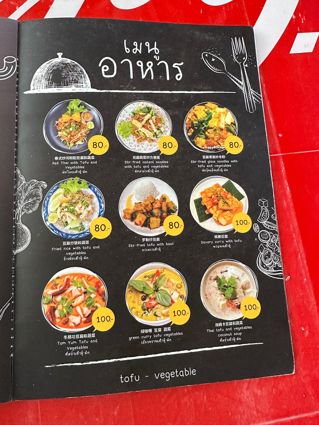 Serves meat, vegan options available. Stall in a food court at Damnoen Saduak Floating Market. Offers a tofu and vegetable menu section with dishes such as pad thai, stir-fried instant noodles, stir-fried glass noodles, fried rice, stir-fried tofu with basil, savory curry, tom yum soup, green curry, and coconut soup. Guests are advised to confirm vegan status of dishes. Open Mon-Sun 8:00am-4:00pm.