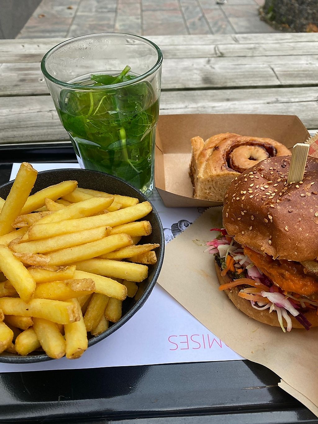 Burger, fries, mayo, chili bowl, Mac n cheeze, and 2 homemade drinks