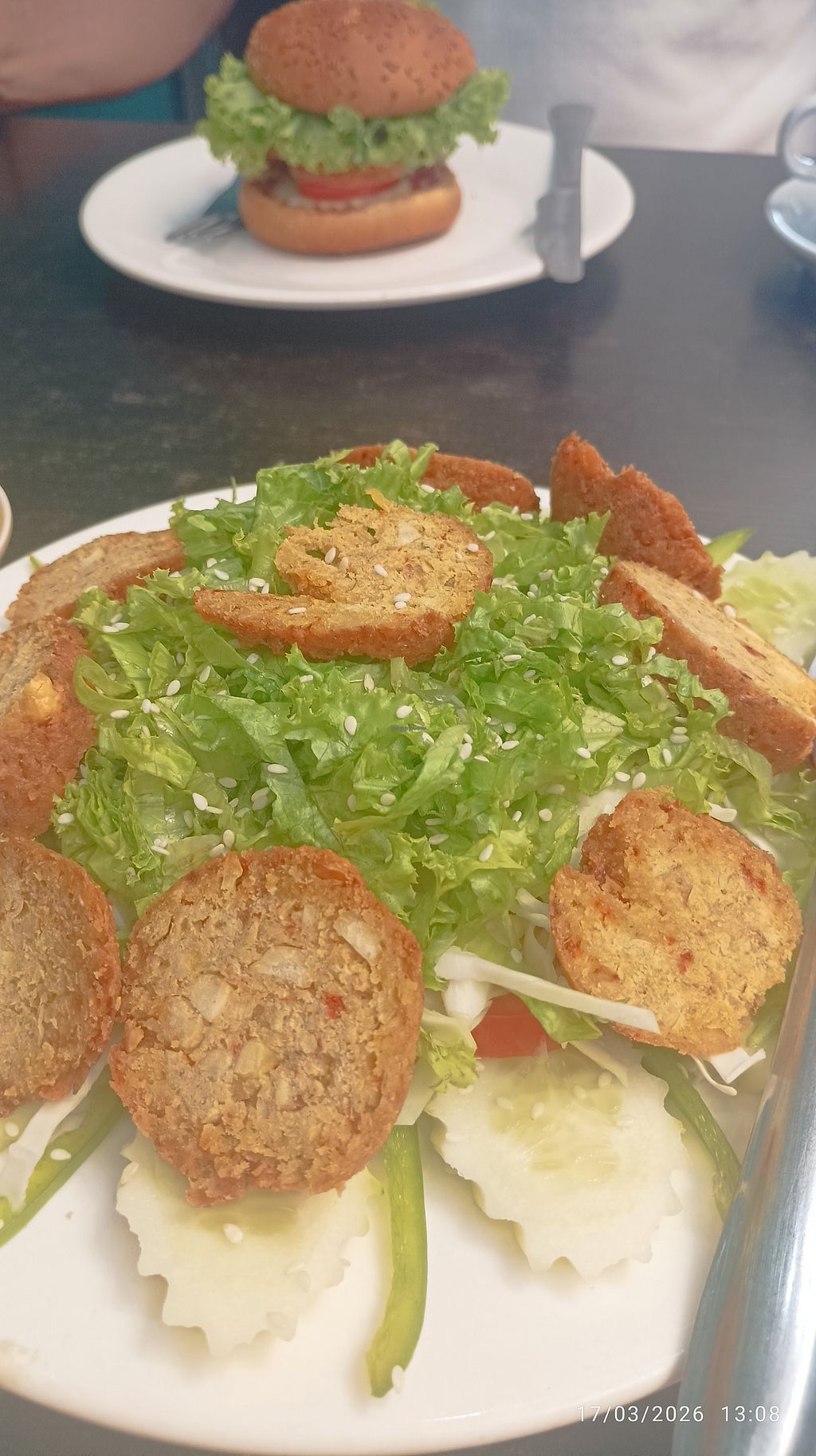 No air con and in a little alley so there wasn’t really air flow at all. They did turn on the fan, but it didn’t help much. I would not recommend the falafel burger. Taste was fine but the texture was awful. Fruit shakes were good though.