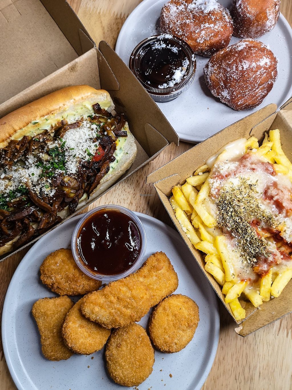 Chicken nuggets, pizza fries, funghi and parmesan sandwich and doughnu…