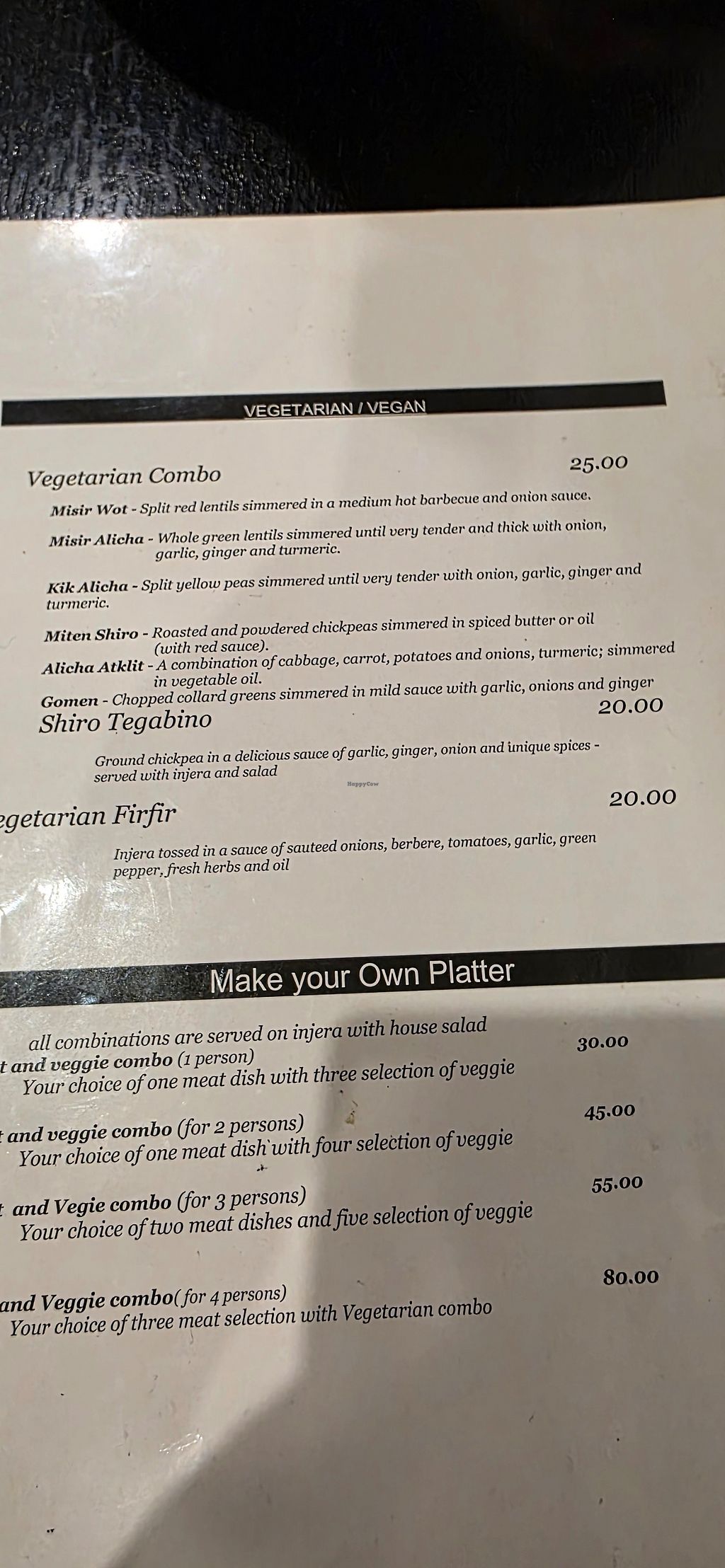 Serves meat, vegan options available. Restaurant offering traditional dishes with clearly marked vegan options like vegetarian platter (assorted lentil, chickpea, and vegetable stews served with injera flatbread), vegetarian firfir (injera pieces tossed with spiced tomato and onion sauce, vegan option available), and shiro tegabino (slow-cooked chickpea stew with garlic, onion, and spices). Open Mon-Thu 1:00pm-10:00pm, Fri 1:00pm-11:00pm, Sat 1:00pm-12:00am, Sun 4:00pm-10:00pm.