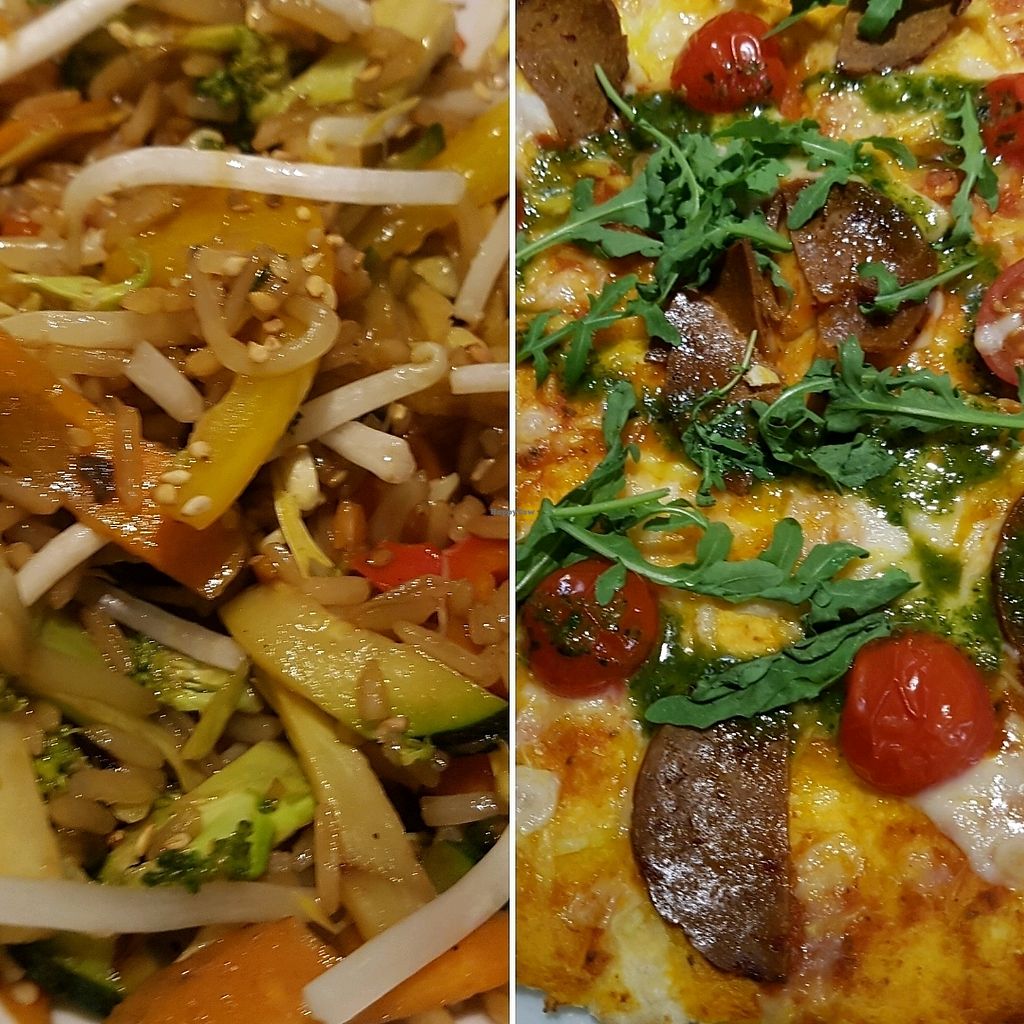 the vegan cheese burger, the penne Bolognese, chick'n nuggets and a pi…