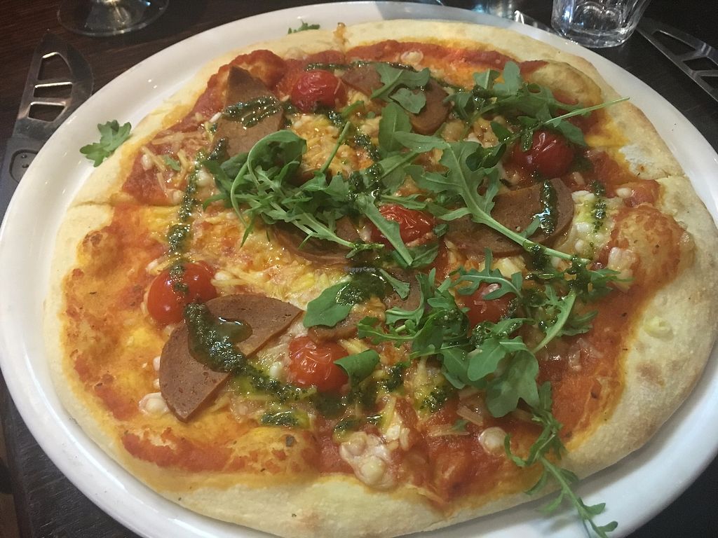 Chorizo pizza with “chorizo,” cherry tomatoes, basil, and pesto! Best …