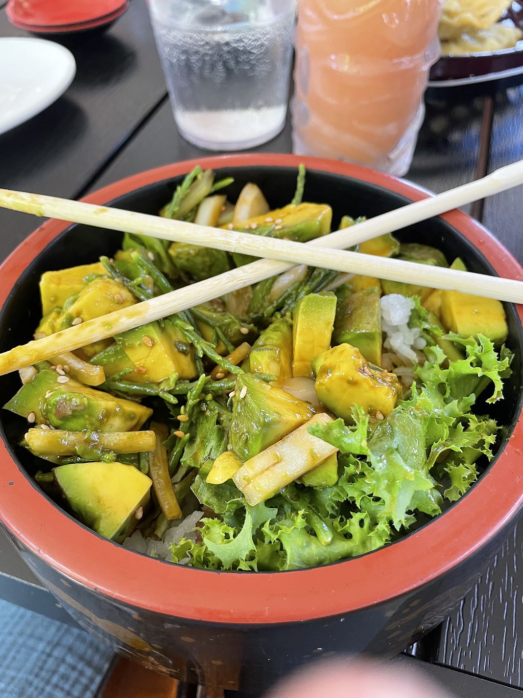We tried the avocado poke bowl, tofu bento bowl, seaweed salad, veggie roll and the grandma’s veggie futomaki (hold the egg). Amazing!! Cool vibe in the place too. Service was excellent despite other reviews to the contrary.