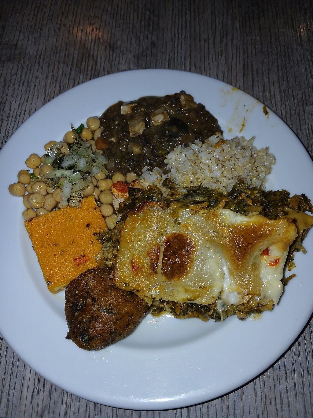 Ein schönes All you can eat Buffet zum kleinen Preis. Als Vorspeisen gab es eine Suppe, verschiedene Salate, Quiche, eine Art Vleischbällchen, Kichererbsen und Oliven. Dann gab es verschiedene Haupgerichte wir Nudelauflauf, Gemüse mit Tofu, irgendwas mit schwarzen Linsen, ein anderes Linsengericht und Vleischbällchen mit Sauce dazu Reis und Naturreis. Das alles für 11,50€ bis mensch satt ist. Alles war übrigens sehr schmackhaft. Desserts gibt es auch noch, allerdings ist das genau wie Getränke nicht im Preis enthalten.