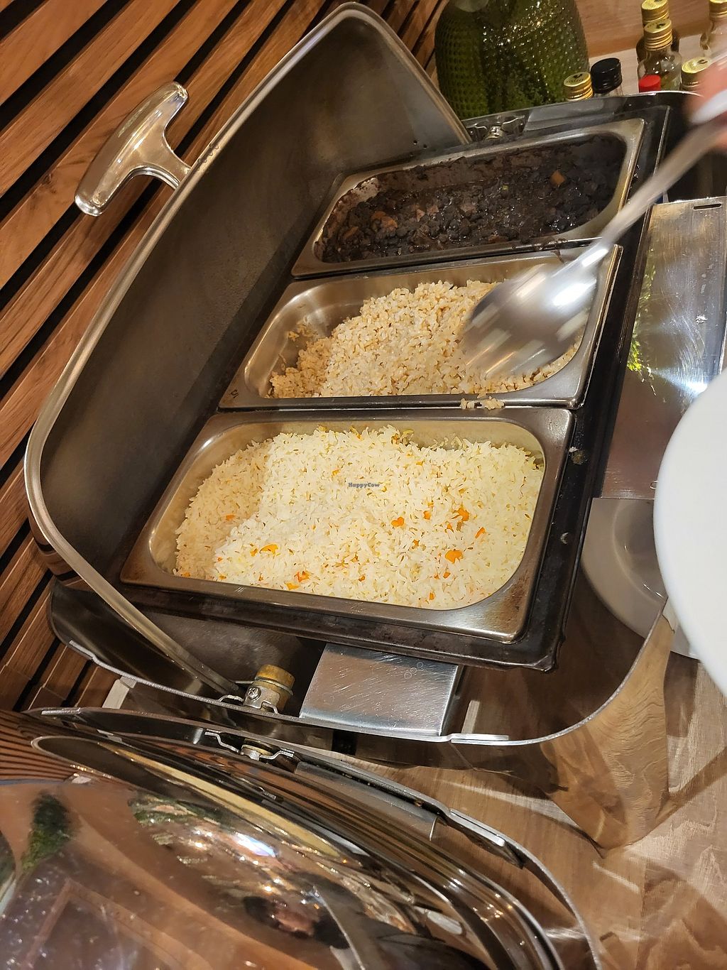 Food options included rice, beans, chickpeas, vegetables in some sauce, fried balls, salad.