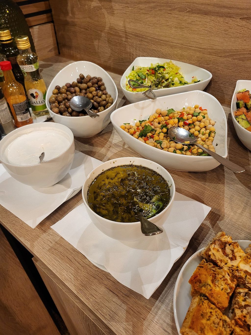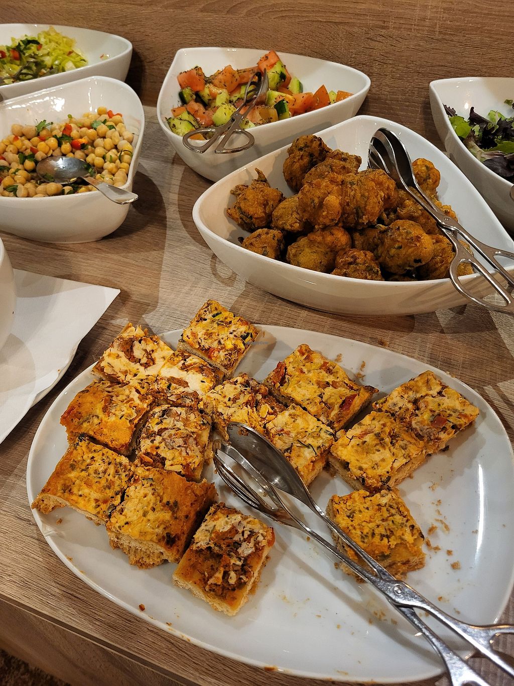 Ein schönes All you can eat Buffet zum kleinen Preis. Als Vorspeisen gab es eine Suppe, verschiedene Salate, Quiche, eine Art Vleischbällchen, Kichererbsen und Oliven. Dann gab es verschiedene Haupgerichte wir Nudelauflauf, Gemüse mit Tofu, irgendwas mit schwarzen Linsen, ein anderes Linsengericht und Vleischbällchen mit Sauce dazu Reis und Naturreis. Das alles für 11,50€ bis mensch satt ist. Alles war übrigens sehr schmackhaft. Desserts gibt es auch noch, allerdings ist das genau wie Getränke nicht im Preis enthalten.