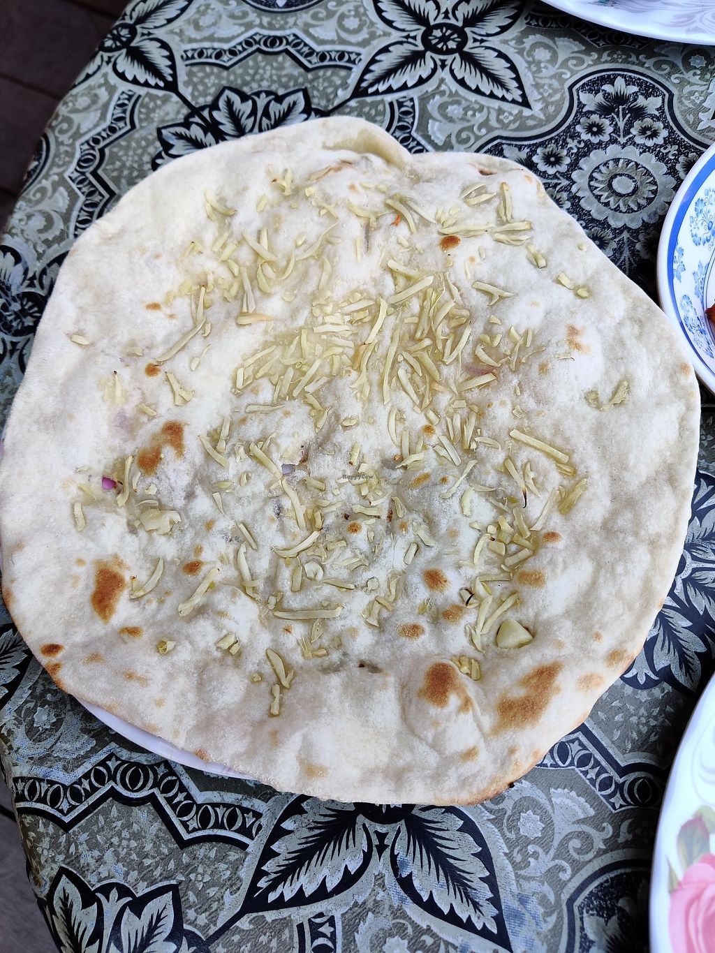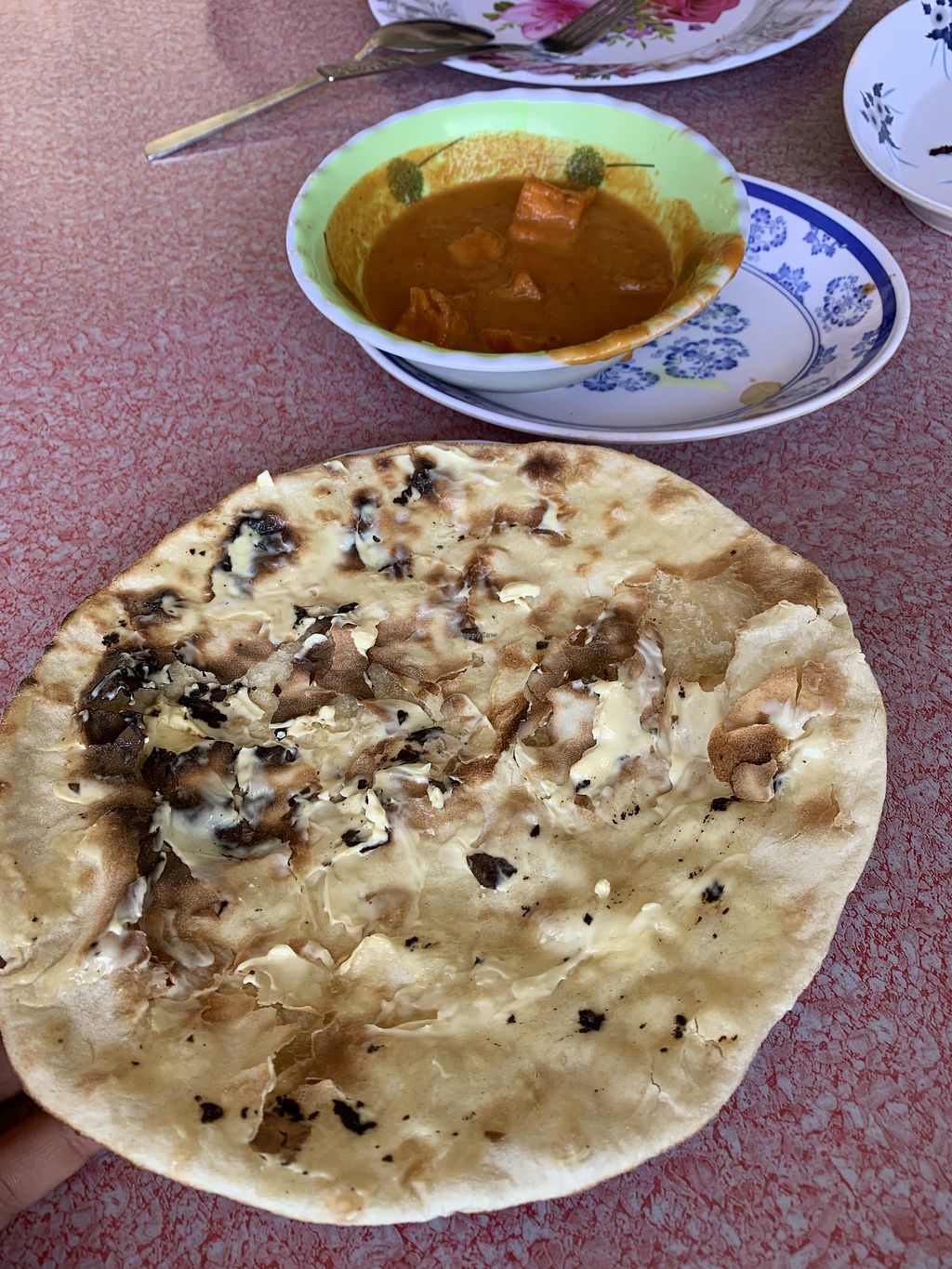 Go buy a cabbage at the Store in the same street and cut it. Use the Nan-bread as a Wrap and put some Curry, the cabbage, pickel onions and maybe some rice in there. We loved it!