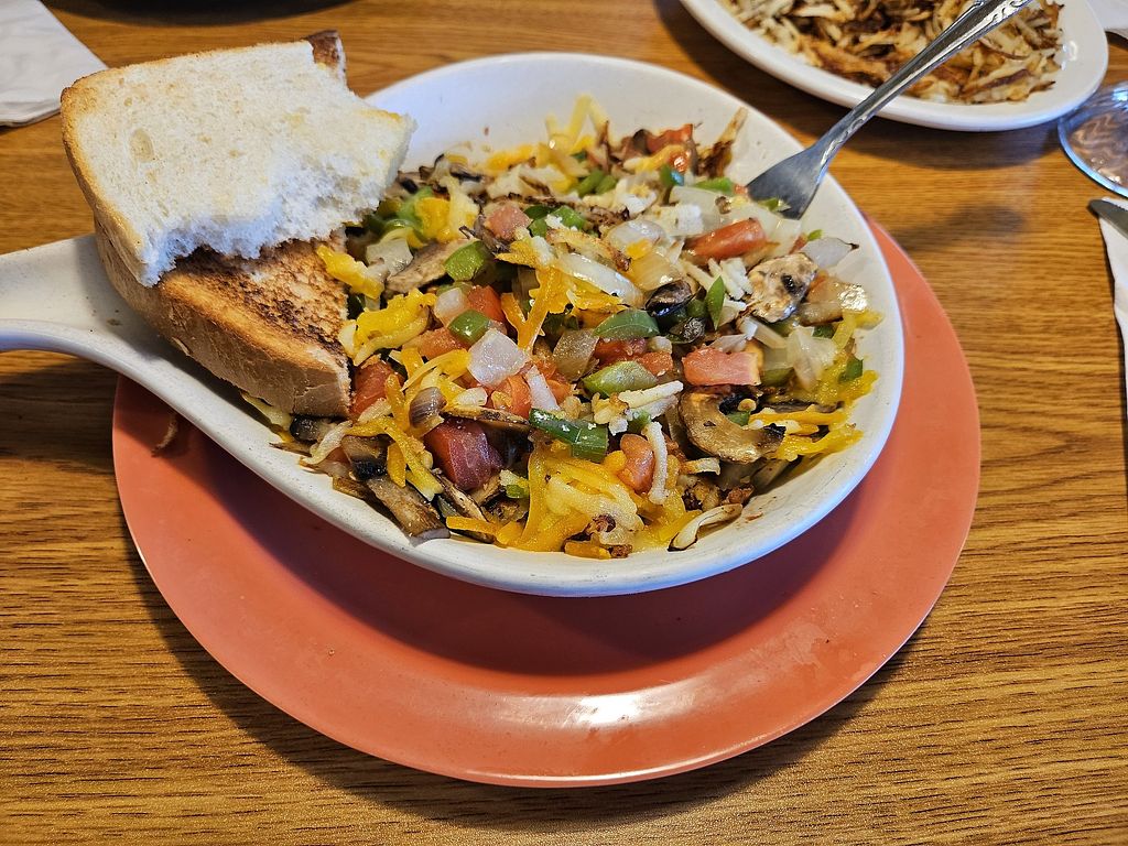 Menu is no longer labeled for their vegan options. You have to ask. They usually have plant egg substitute, vegan sausage, and vegan cheese, but because we came on their last day open for the season, they only had the vegan cheese available. I got the veggie skillet, no egg, with extra veggies, vegan cheese, and dry sourdough toast.