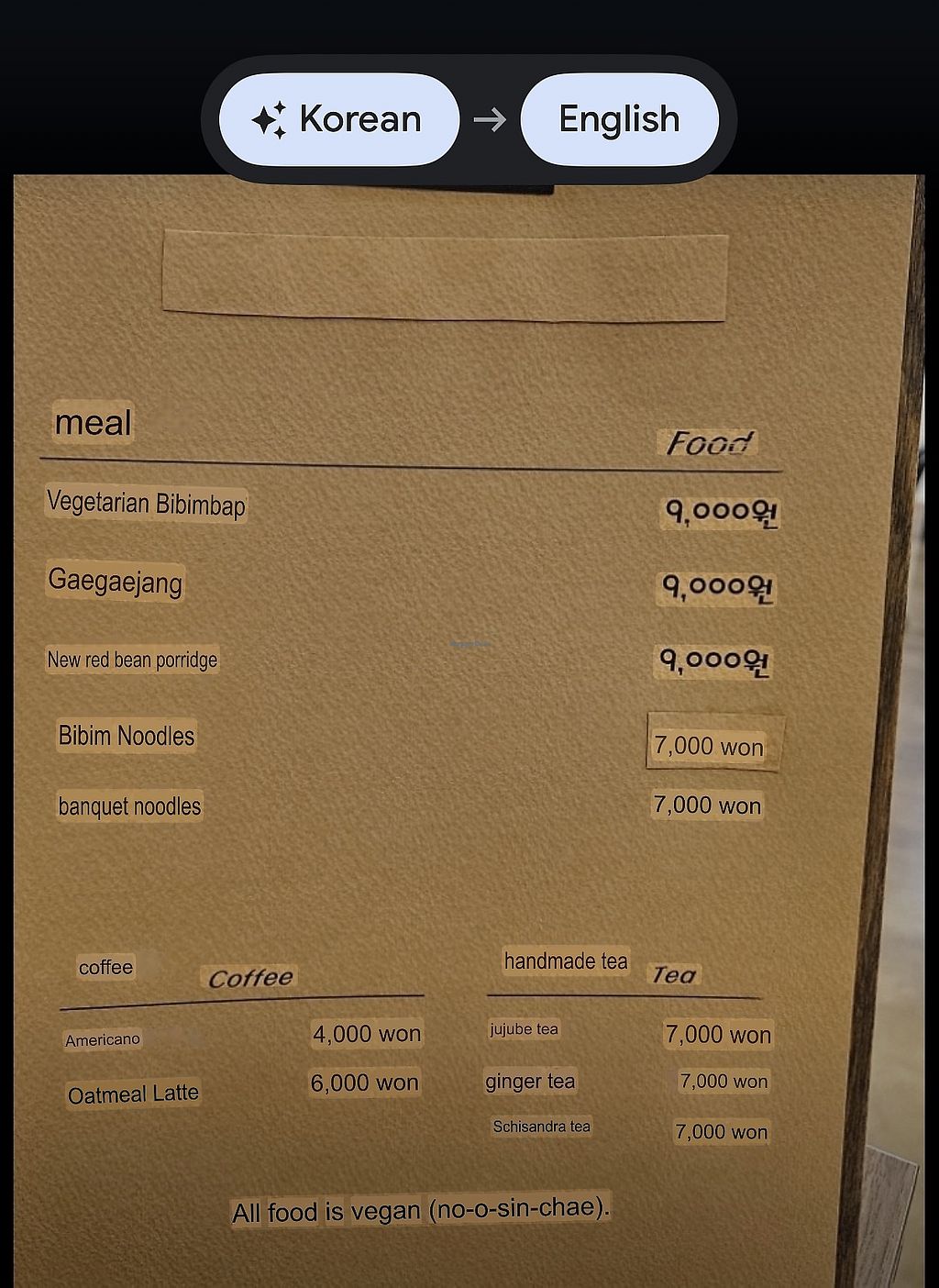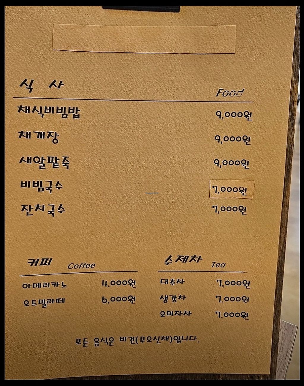 Food only portion of menu (Korean)