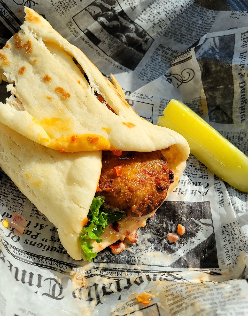 Serves meat, vegan options available. Offers vegan dishes on the menu such as the Impossible burger with vegan mayo, samosa pot pie, hummus platter, buffalo cauliflower bites, falafel hummus wrap, curried sweet potato and cauliflower wrap and sweet potato fries. Reported closed May 2025.